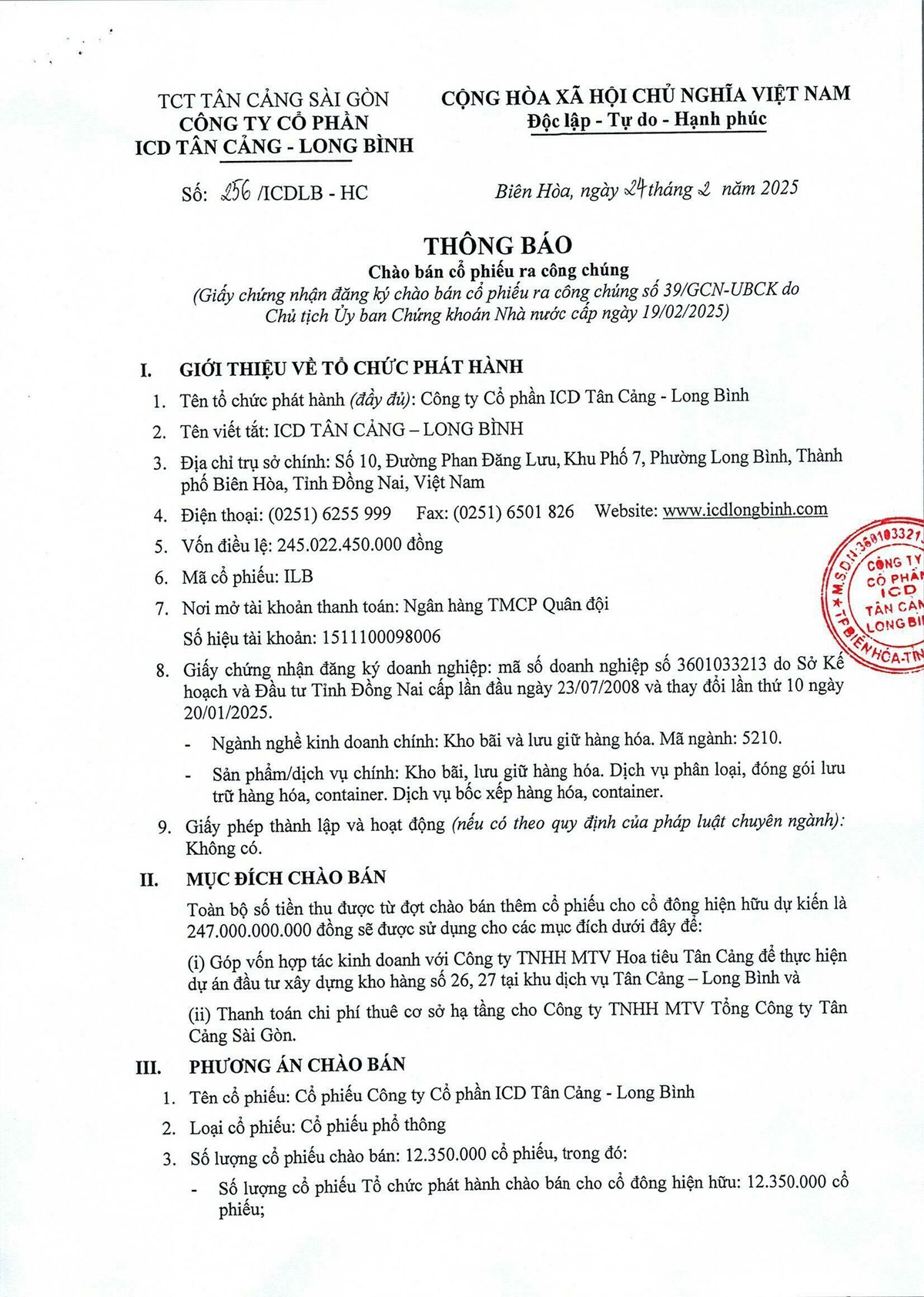 Công ty cổ phần ICD Tân Cảng - Long Bình (ILB) thông báo chào bán cổ phiếu ra công chúng (kỳ 1) 24/02/2025 15:03