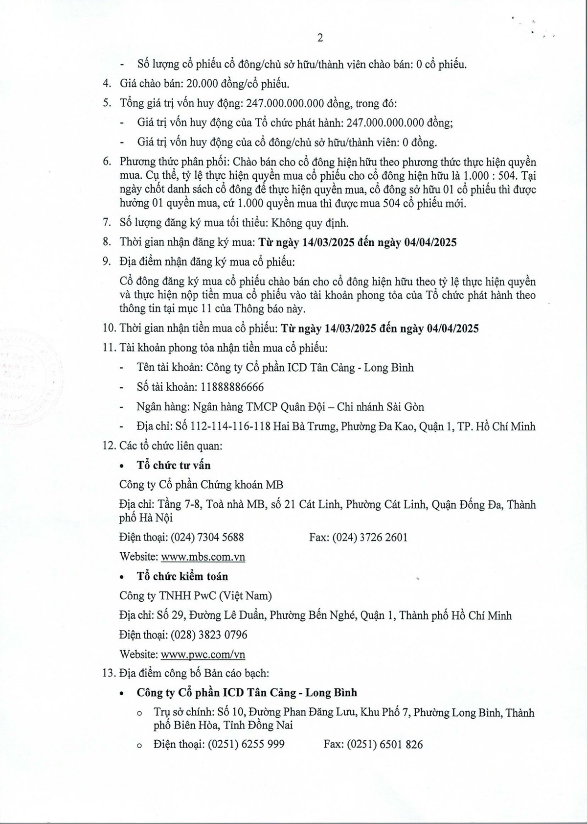 Công ty cổ phần ICD Tân Cảng - Long Bình (ILB) thông báo chào bán cổ phiếu ra công chúng (kỳ 2) 25/02/2025 07:00