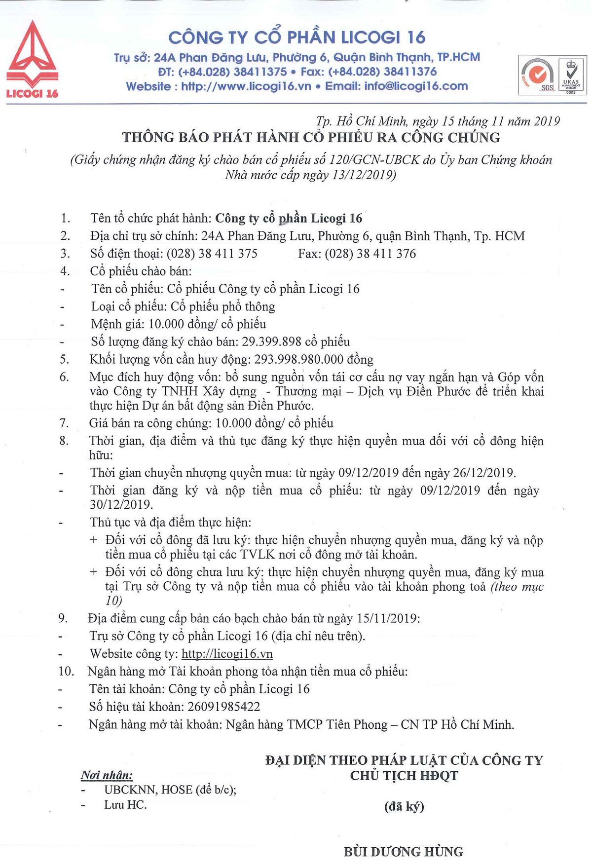 Công ty cổ phần Licogi 16 thông báo phát hành cổ phiếu ra công chúng (thay đổi)