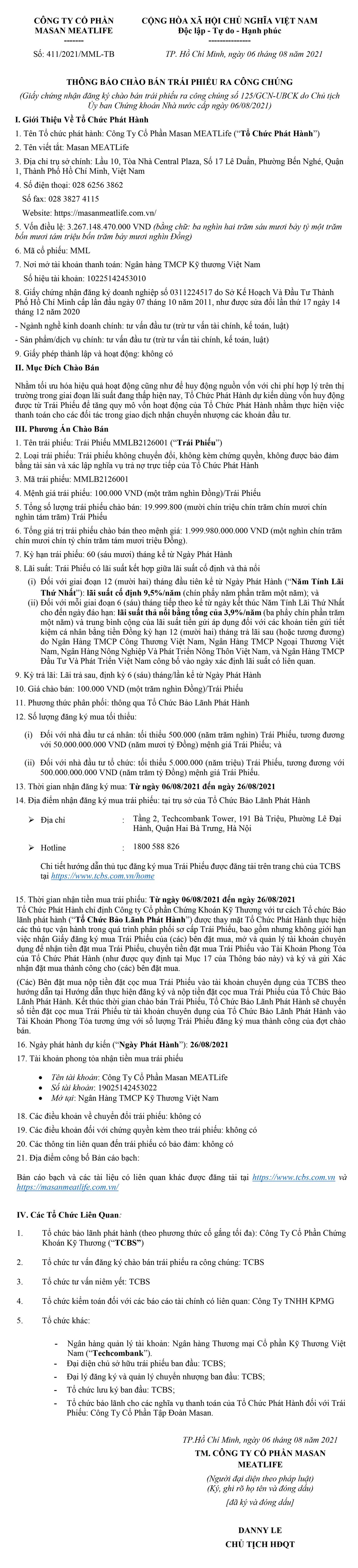 Công ty cổ phần Masan Meatlife thông báo chào bán trái phiếu ra công chúng