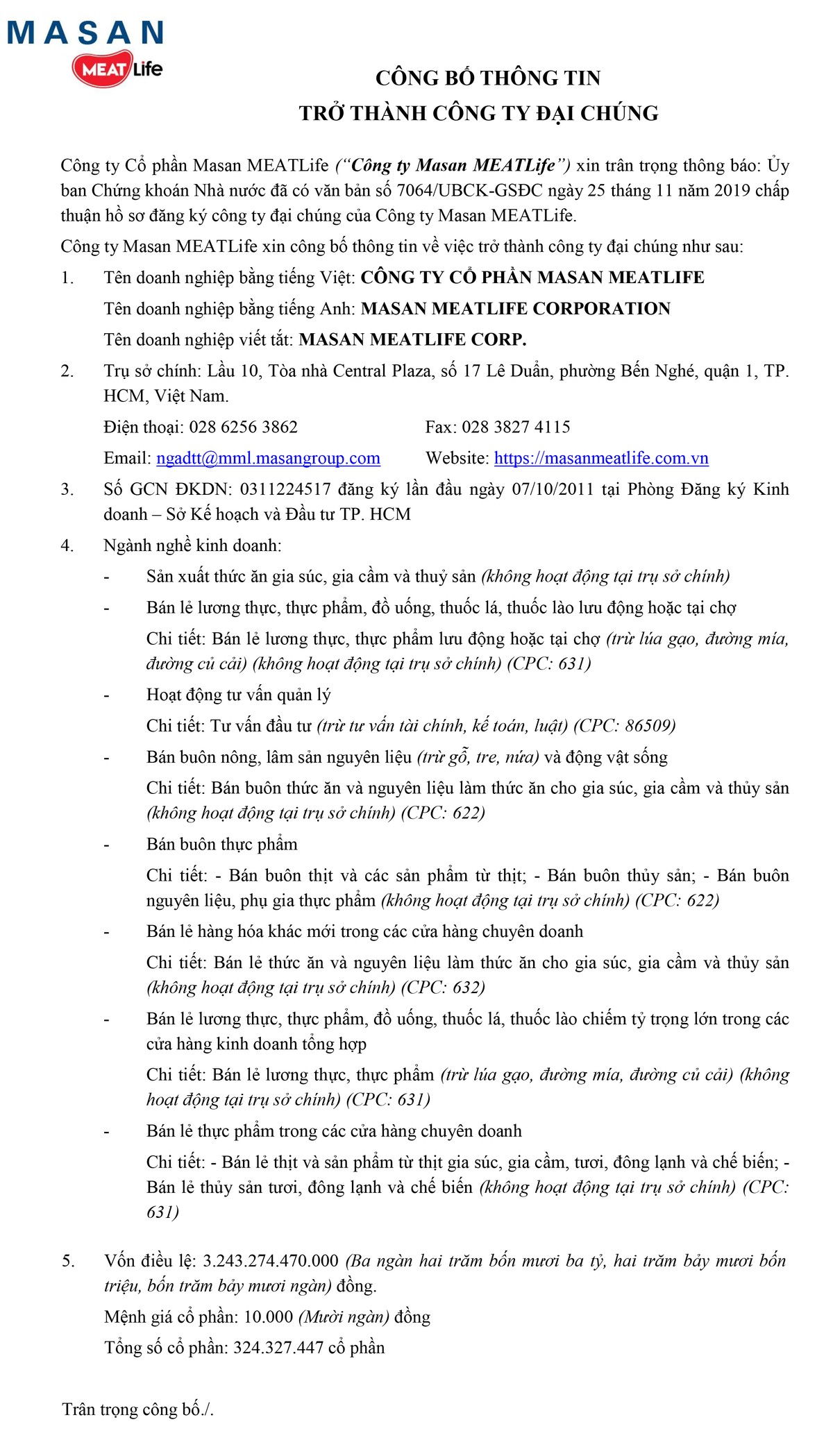 Công ty Cổ phần Masan MEATLife thông báo trở thành công ty đại chúng