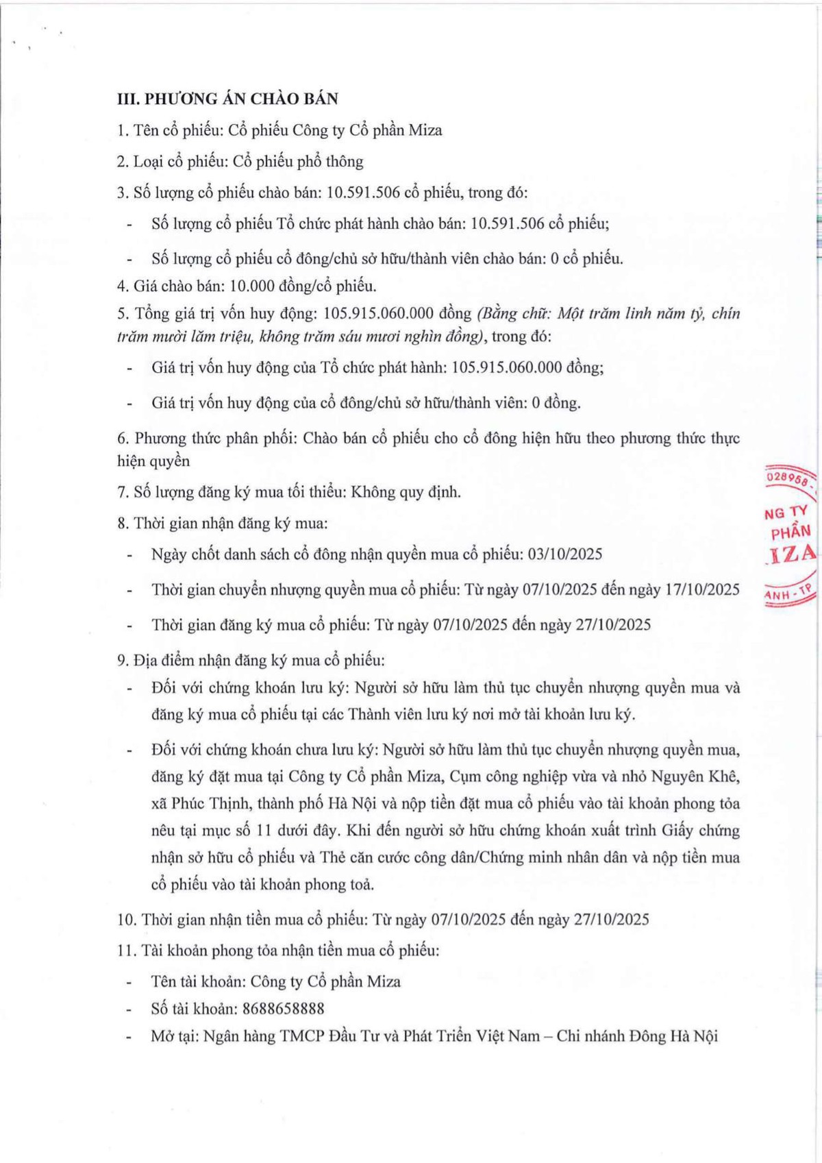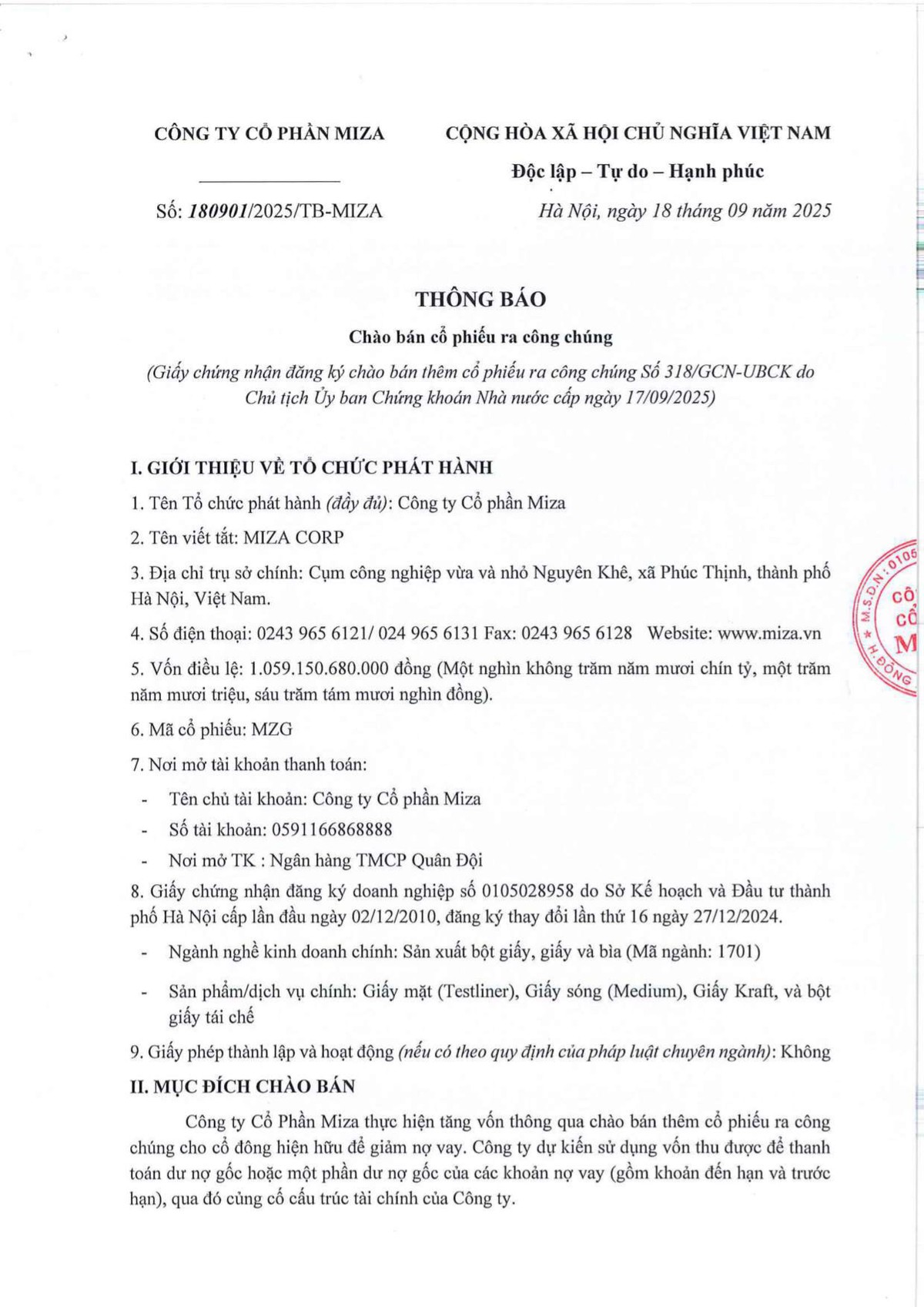 Công ty Cổ phần Miza (mã cổ phiếu MZG) thông báo triển khai chào bán cổ phiếu ra công chúng (Kỳ 1) 18/09/2025 16:30