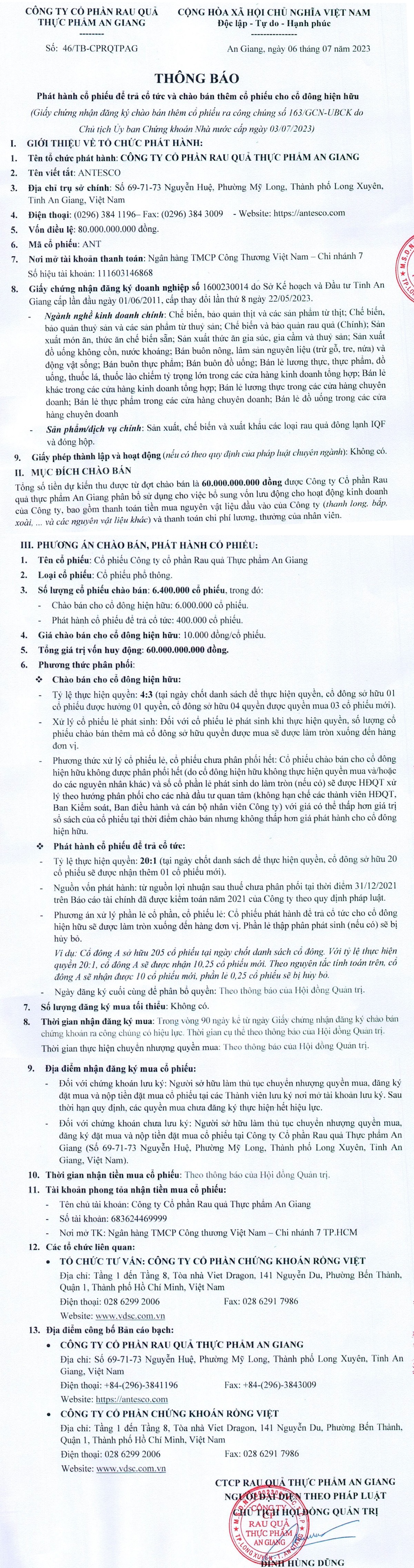 Công ty cổ phần Rau quả Thực phẩm An Giang (ANT) thông báo phát hành cổ phiếu để trả cổ tức và chào bán thêm cổ phiếu cho cổ đông hiện hữu 06/07/2023 19:15