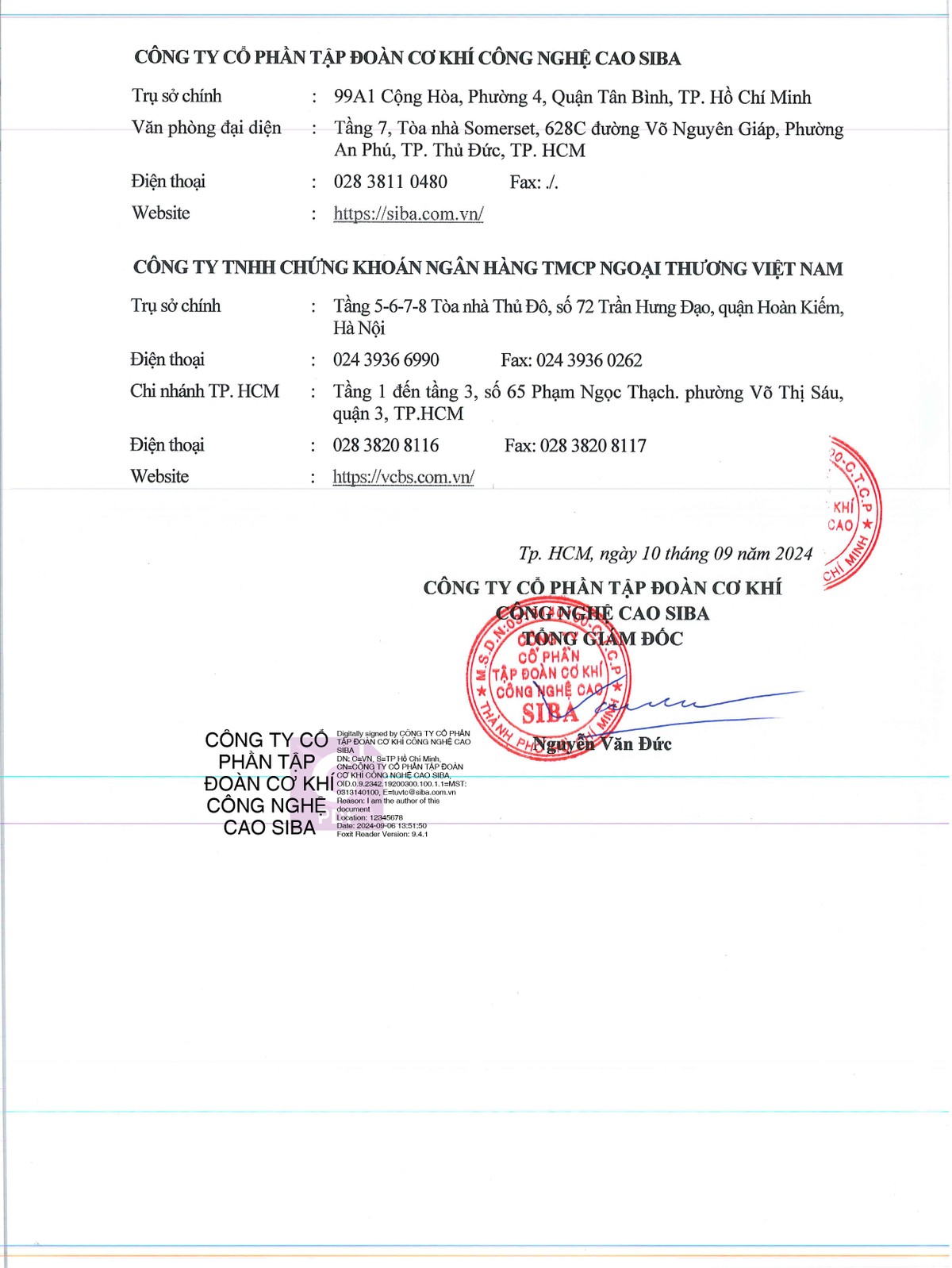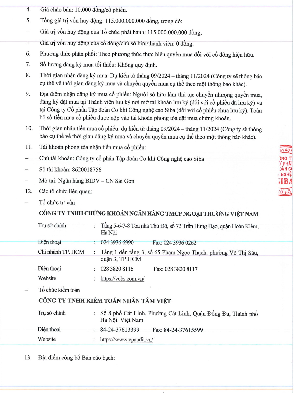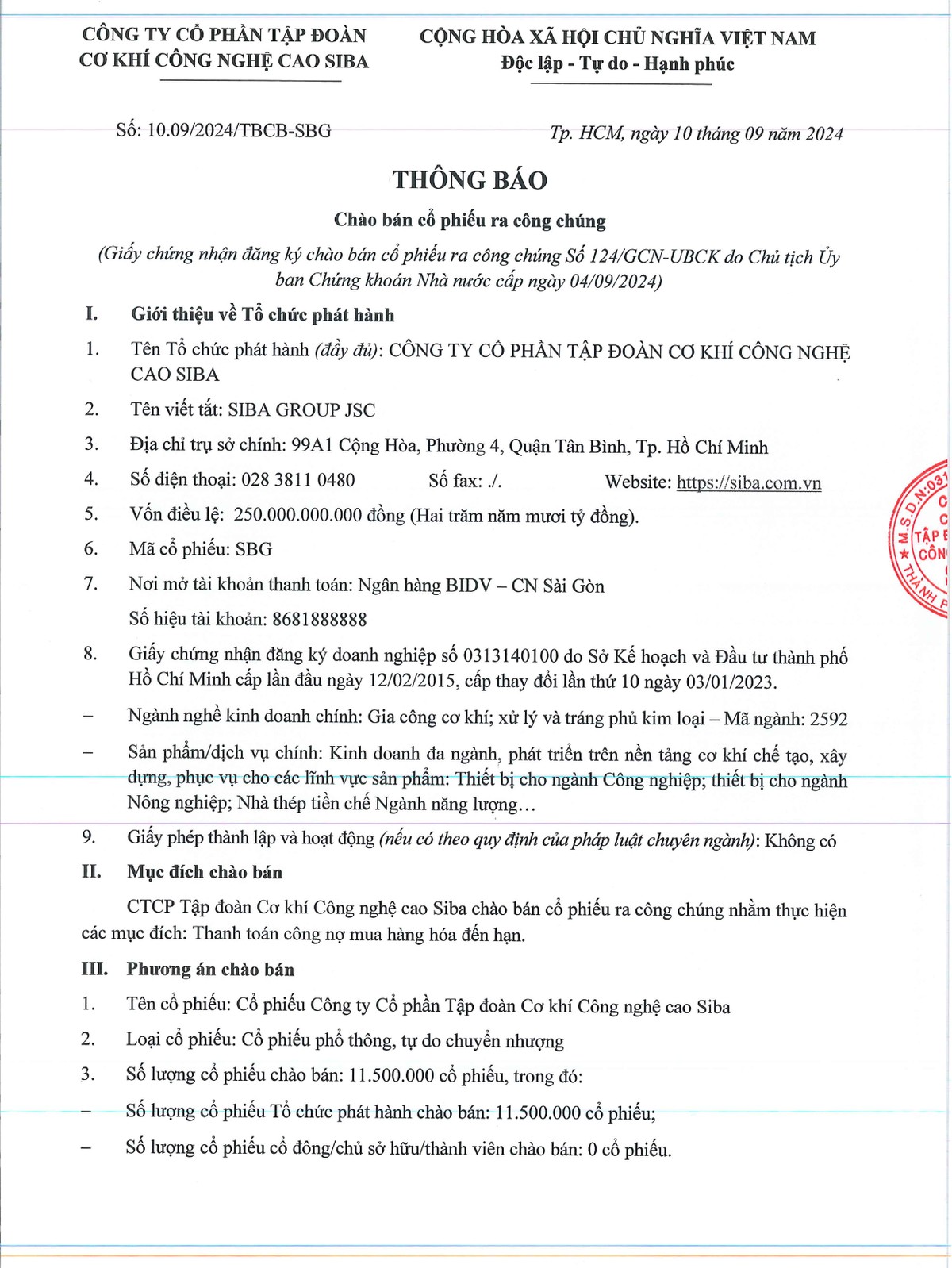 Tin liên quan Siba Group (SBG) được cấp phép chào bán 11,5 triệu cổ phiếu để thanh toán công nợ 06/09/2024 06:45 Siba Group (SBG) chấm dứt hoạt động dự án Đầu tư Nhà máy cơ khí tại tỉnh Nghệ An khi kinh doanh đi lùi 28/08/2024 07:04 Siba Group (SBG): Lợi nhuận sau thuế giảm 39,6% trong nửa đầu năm 2024, về 11,19 tỷ đồng 27/07/2024 09:45 Từ khóa Siba SBG