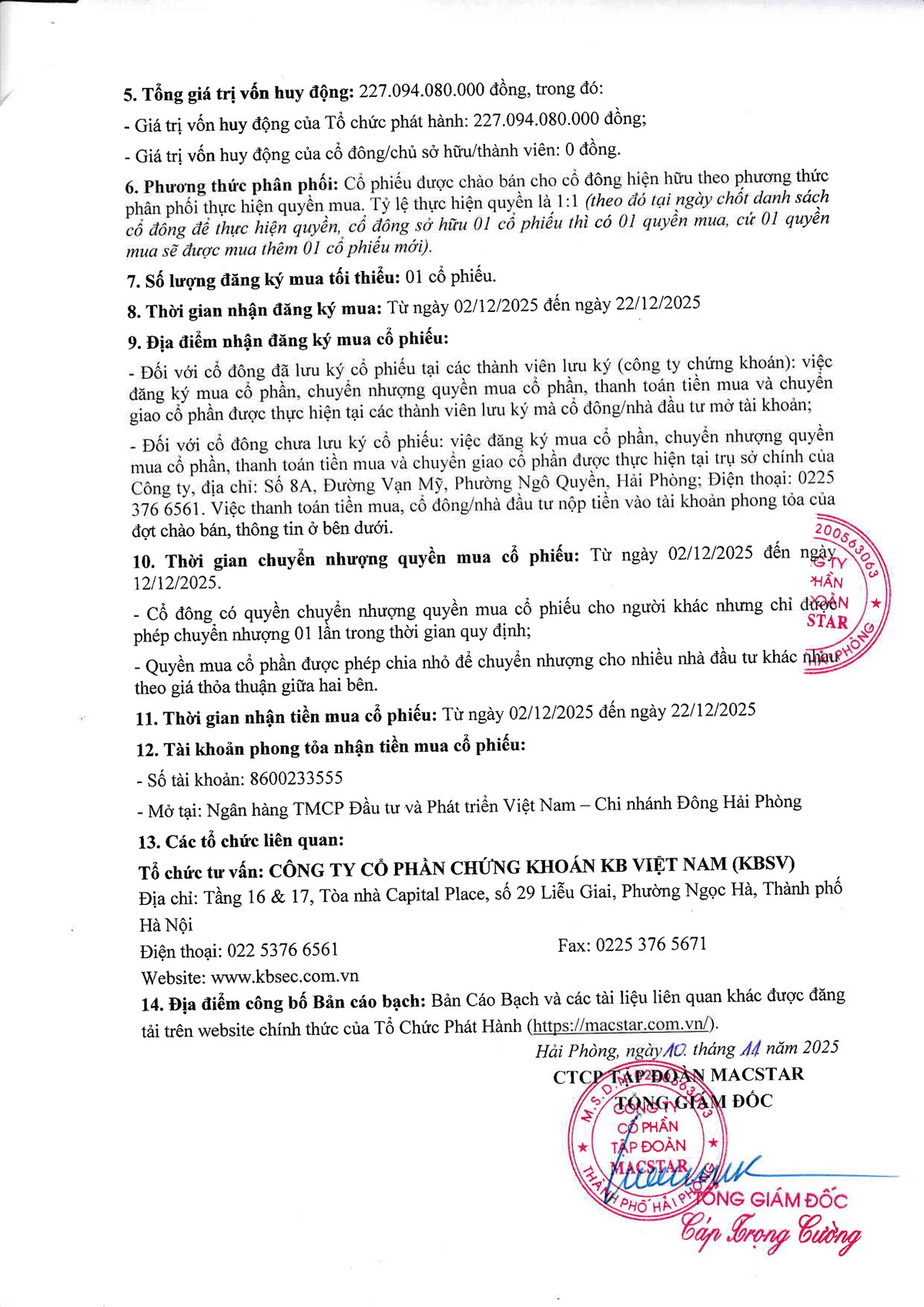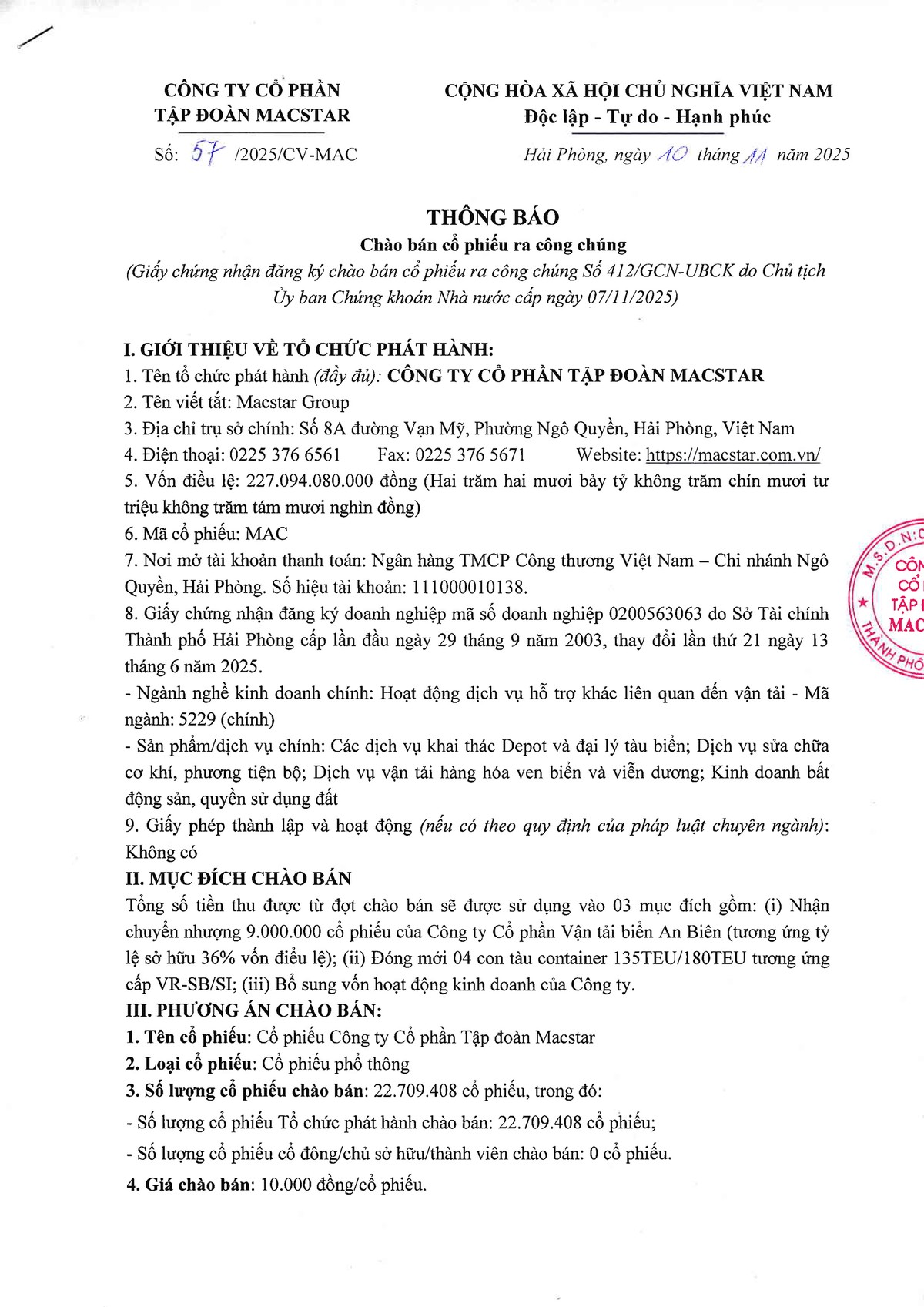 Công ty cổ phần Tập đoàn Macstar (MAC) thông báo chào bán cổ phiếu ra công chúng (Kỳ 1) 10/11/2025 14:26