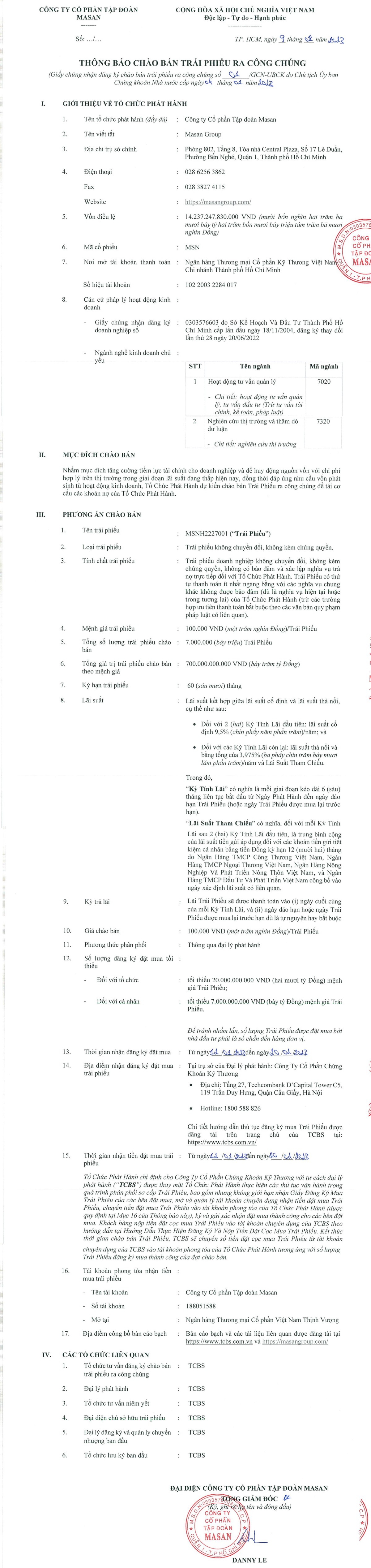 Công ty cổ phần Tập đoàn Masan (MSN) thông báo chào bán trái phiếu ra công chúng