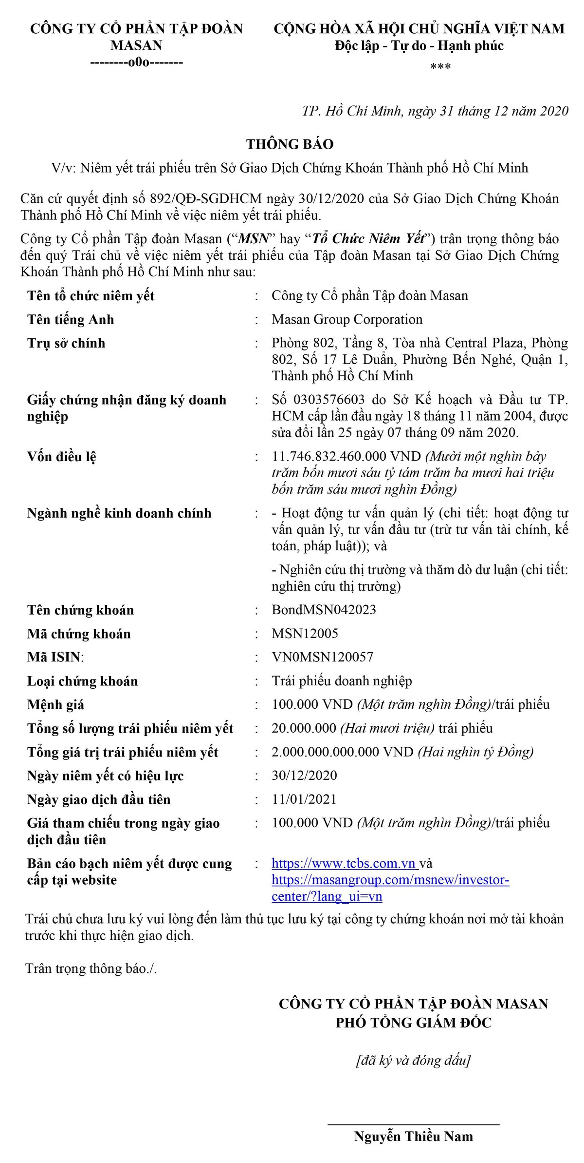 Công ty cổ phần Tập đoàn Masan thông báo niêm yết trái phiếu trên Sở GDCK TP.HCM