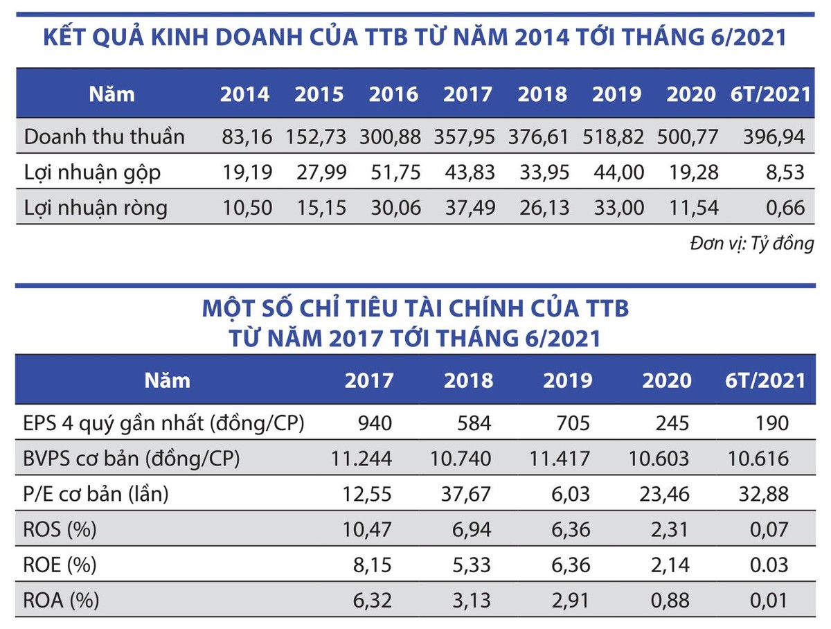 Kết thúc nửa đầu năm 2021, tình trạng “doanh thu cao, lợi nhuận hẻo” vẫn tiếp diễn, khi TTB đạt gần 397 tỷ đồng doanh thu, nhưng lợi nhuận thu về chỉ vỏn vẹn 660 triệu đồng.