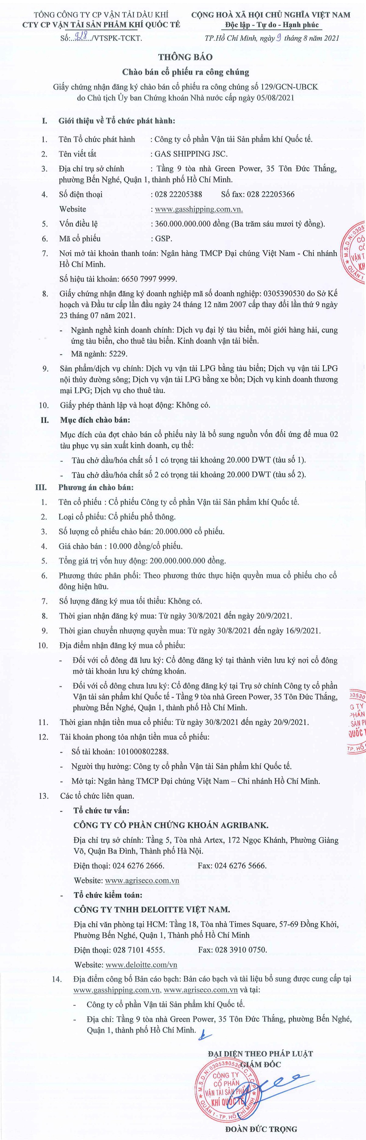 Công ty cổ phần Vận tải sản phẩm khí quốc tế thông báo chào bán cổ phiếu ra công chúng
