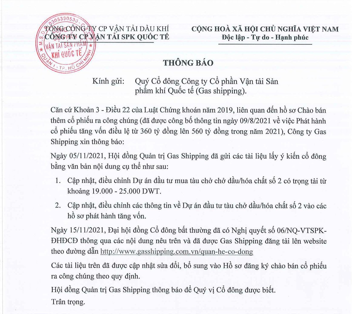 Công ty cổ phần Vận tải sản phẩm khí Quốc tế thông báo kết quả gửi tài liệu lấy ý kiến cổ đông bằng văn bản