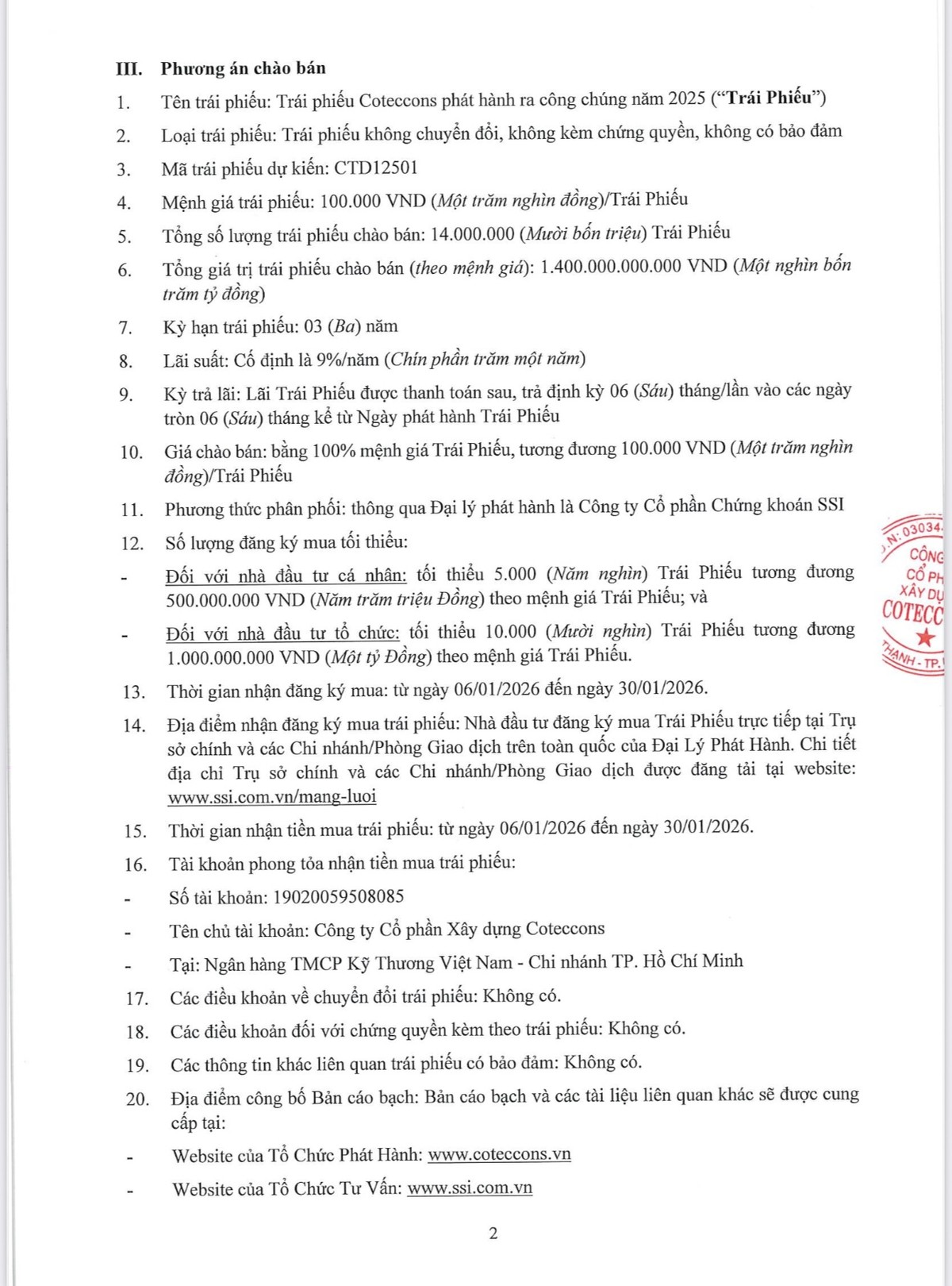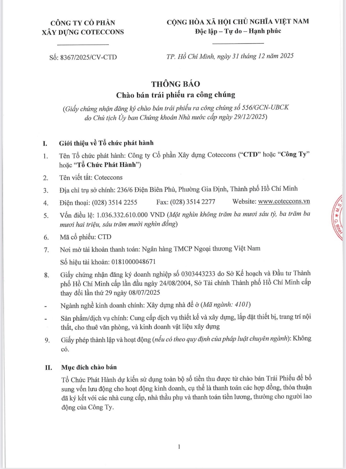 Công ty Cổ phần Xây dựng Coteccons (CTD) thông báo chào bán trái phiếu ra công chúng ( kỳ 1)