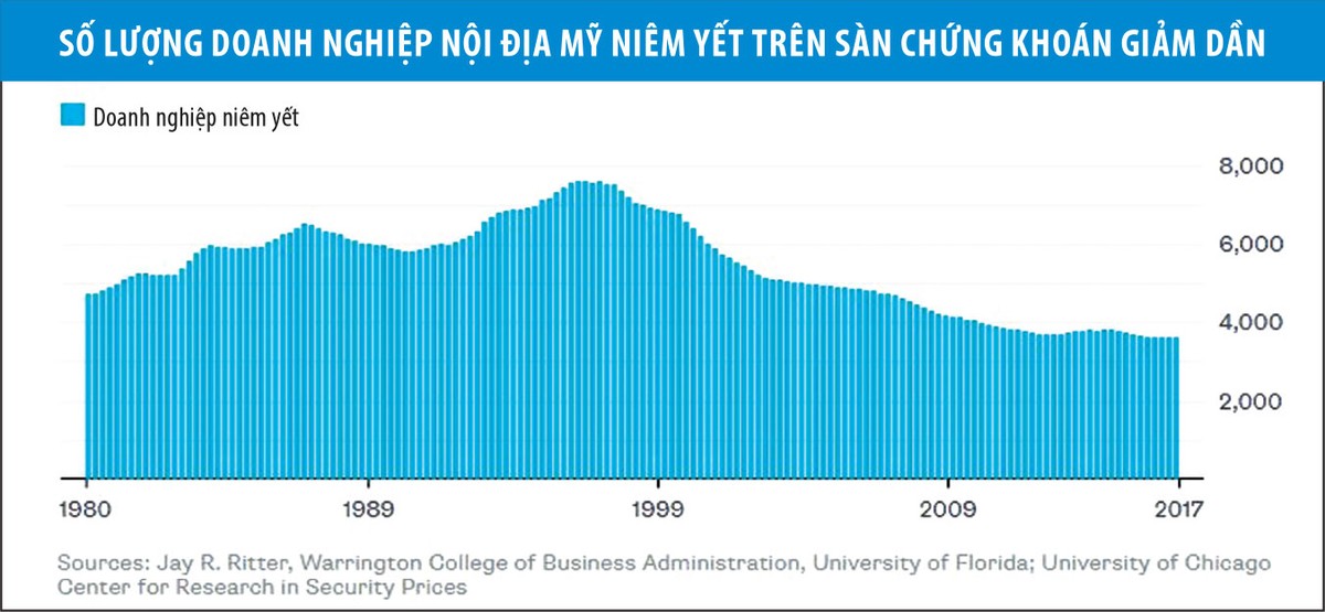 Bên cạnh đó, hoạt động mua bán và sáp nhập cũng khiến hàng trăm công ty đại chúng giảm đi. Tính tới cuối năm 2017, chỉ có 3.600 doanh nghiệp niêm yết tại sàn chứng khoán Mỹ, giảm hơn một nửa so với năm 1997.