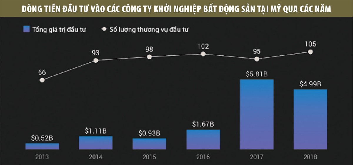 Năm 2018, các công ty khởi nghiệp tại lĩnh vực bất động sản tại Mỹ đã thu hút được 4,99 tỷ USD đầu tư thông qua 105 thương vụ, theo số liệu của Crunchbase. Con số này giảm so với mức 5,8 tỷ USD thông qua 95 thương vụ năm 2017, nhưng vẫn cao hơn gấp 10 lần so với mức 520 triệu USD vào năm 2013.