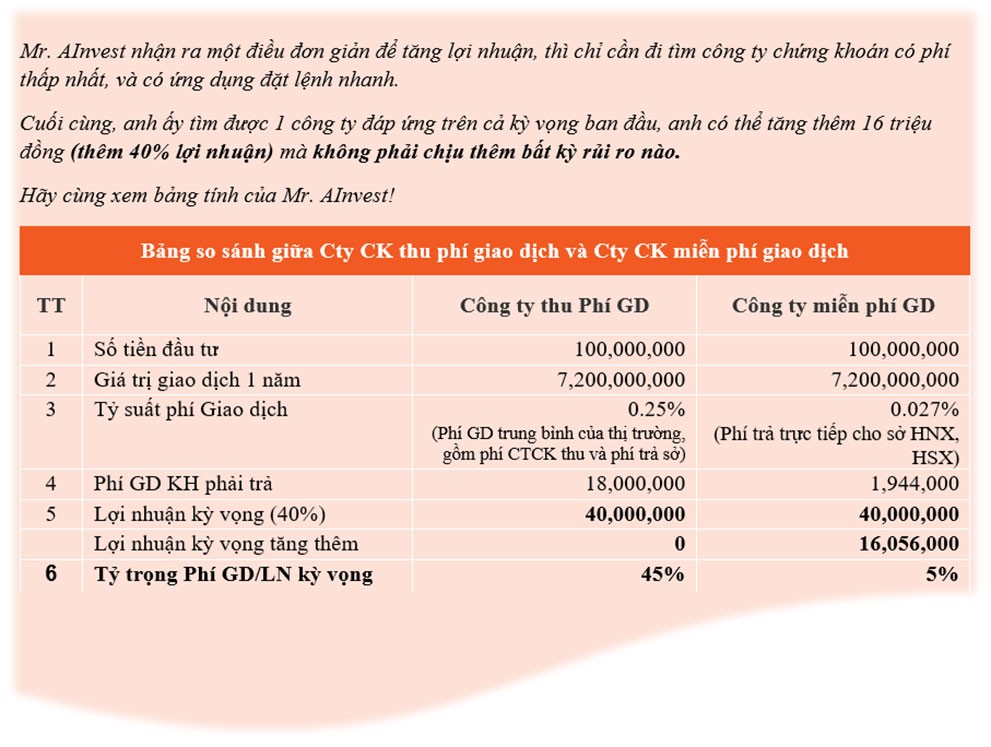 Giống như Mr. AInvest, những nhà đầu tư có khả năng tự giao dịch sẽ luôn tìm hiểu và quan tâm đến những công ty có chính sách phí giao dịch tốt, cũng như đầu tư nhiều vào công nghệ.