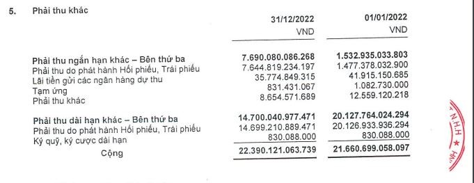 Báo cáo tài chính năm 2022 của DATC cũng ghi nhận khoản phải thu và phải trả phát hành hối phiếu, trái phiếu khá lớn.Trong bản thuyết minh chi tiết các khoản phải thu ngắn hạn khác của DATC có đến 7.644 tỷ đồng phải thu do phát hành hối phiếu, trái phiếu và phải thu dài hạn phát hành trái phiếu, hối phiếu là 14.699 tỷ đồng. Tổng phải thu với phát hành hối phiếu, trái phiếu đến 31/12/2022 lên đến trên 22.300 tỷ đồng.