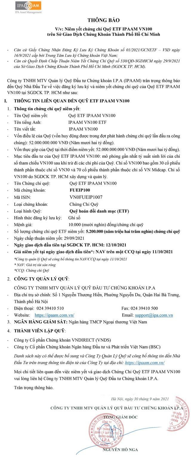 Chia sẻ Chia sẻ Tin liên quan Công ty TNHH Quản lý Quỹ Mirae Asset thông báo đăng ký lưu ý và niêm yết chứng chỉ Quỹ ETF MAFM VN30 trên HOSE 19/11/2020 08:00 Công ty Quản Lý Quỹ SSI thông báo đăng ký lưu ký và niêm yết chứng chỉ Quỹ ETF SSIAM VN30 trên HOSE 10/08/2020 14:47 Vinacapital thông báo đăng ký lưu ký và niêm yết chứng chỉ Quỹ ETF VINACAPITAL VN100 trên HOSE 15/07/2020 07:47 Từ khóa Quỹ ETF IPAAM VN100