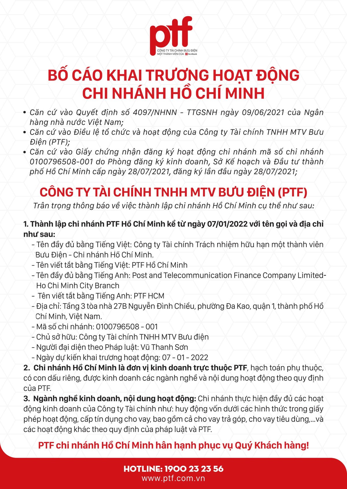 Công ty Tài chính TNHH một thành viên Bưu điện (PTF) bố cáo khai trương chi nhánh Hồ Chí Minh