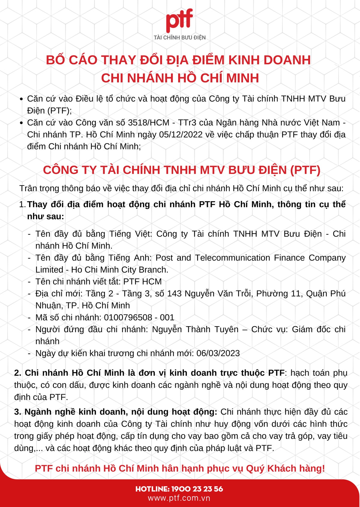 Chia sẻ Chia sẻ Tin liên quan Ngân hàng Nông nghiệp và Phát triển nông thôn thông báo chào bán trái phiếu ra công chúng 11/12/2022 07:21 Thông báo bán đấu giá quyền mua cổ phần của Tập đoàn Bưu chính Viễn thông Việt Nam tại CTCP Thanh toán Điện tử VNPT 05/01/2023 09:00 Tổng công ty Cổ phần Tái bảo hiểm PVI thông báo chào bán cổ phiếu ra công chúng 07/12/2022 08:00 Từ khóa MTV Bưu điện PTF