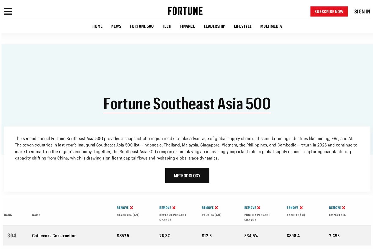 2025 là lần thứ hai liên tiếp, Coteccons được BXH Fortune SEA 500 vinh danh. Năm 2024, Coteccons đứng hạng 376 và năm nay đã thăng 72 hạng, giữ vị trí 304.