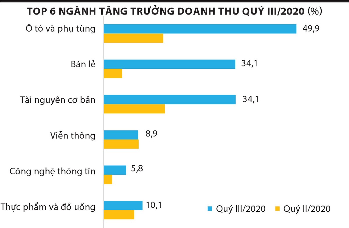 Đặc biệt, doanh nghiệp trong một số ngành ghi nhận sự tăng trưởng mạnh cả về doanh thu và lợi nhuận, như tài nguyên cơ bản, ô tô, phụ tùng và bán lẻ.
