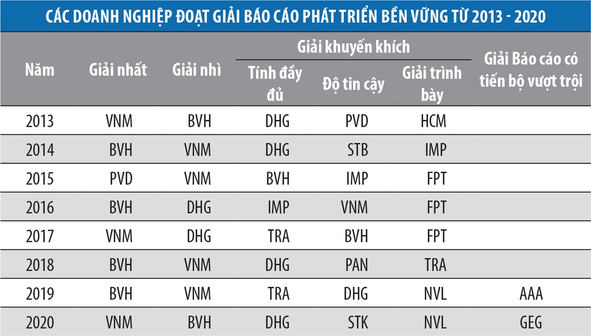 Nhìn lại các doanh nghiệp đạt giải Báo cáo phát triển bền vững từ năm 2013 trở lại đây cho thấy, đây đều là những doanh nghiệp đầu ngành, có kết quả kinh doanh ấn tượng và giữ vững được phong độ.