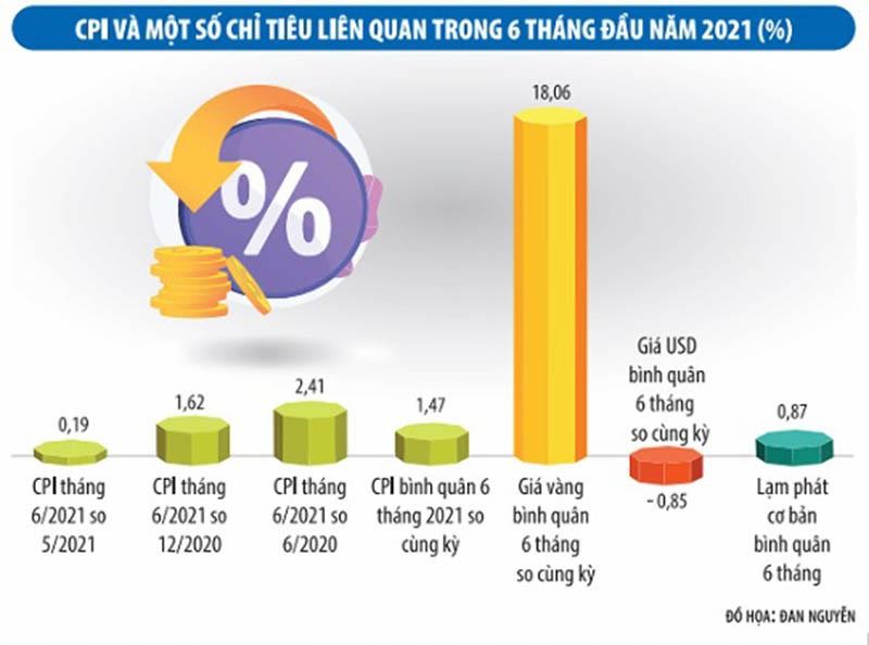 Trước hết là xét theo thời gian. Tính theo tháng, trong 6 tháng có 3 tháng giảm, 3 tháng tăng. Tính sau 6 tháng (so tháng 6/2021 với tháng 12/2020), CPI vẫn còn thấp xa so với tốc độ tăng được dự báo cho cả năm. Tính sau 1 năm (so tháng 6 năm nay với tháng 6 năm trước), tuy đã tăng ở mức tương đối cao, nhưng chủ yếu do nhu cầu tiêu dùng tháng 6 năm nay đã được cải thiện hơn so với tháng 6 năm trước, trạng thái “bình thường mới” đã rõ hơn sau một năm rưỡi thực hiện mục tiêu “kép” là vừa phòng chống Covid-19, vừa khôi phục, phát triển kinh tế - xã hội. Tính bình quân 6 tháng đầu năm nay so với cùng kỳ năm trước, CPI còn thấp xa so với mục tiêu cả năm (khoảng 4%) theo Nghị quyết của Quốc hội.