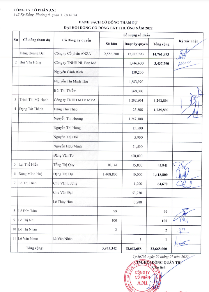 Theo danh sách cổ đông mà ANI vừa công bố thông tin bổ sung vào Biên bản đại hội, trong tổng số 11 cổ đông tham dự đại hội có 5 cổ đông là cổ đông lớn hoặc nhận ủy quyền cổ đông lớn của ANI và chỉ có 6 cổ đông nhỏ sở hữu, nhận ủy quyền hơn 110.000 cổ phần, đã bỏ phiếu thông qua hủy niêm yết, trong khi ANI có gần 500 cổ đông.