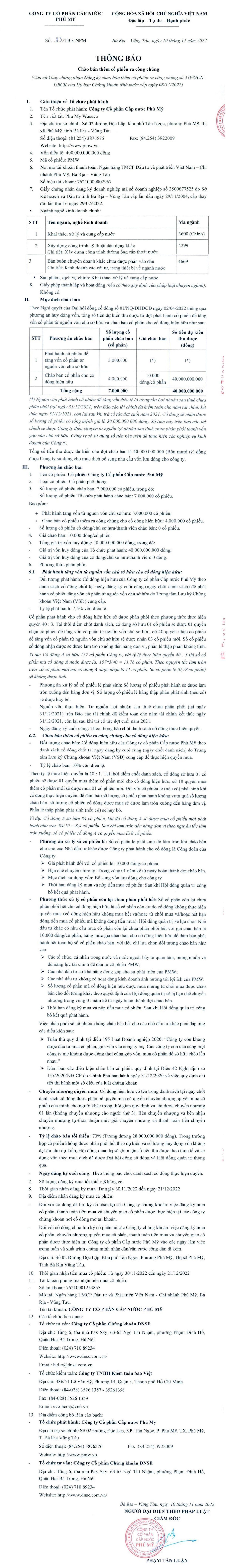 Cấp nước Phú Mỹ (PMW) sẽ phát hành cổ phiếu thưởng, tỷ lệ 40:3 và chào bán ra công chúng giá 10.000 đồng/CP 13/04/2022 09:50