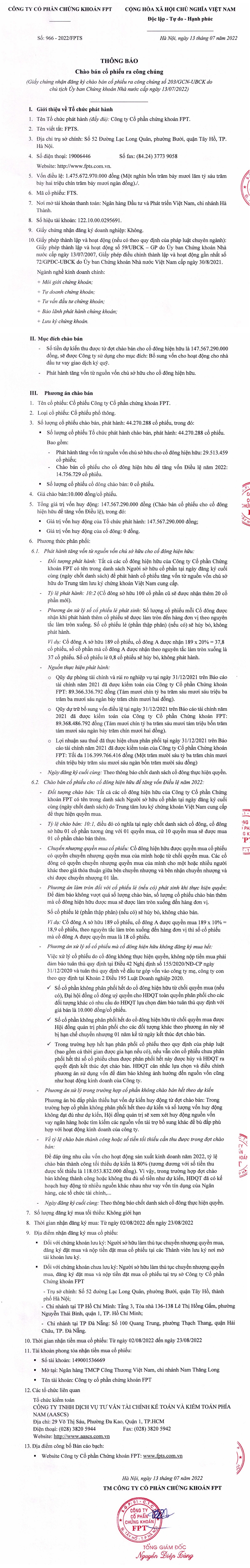 Chia sẻ Chia sẻ Tin liên quan CTCP Chứng khoán Rồng Việt thông báo phát hành và chào bán cổ phiếu ra công chúng 14/07/2022 07:00 Thông báo bán đấu giá quyền mua cổ phần của Tập đoàn Bưu chính Viễn thông Việt Nam tại CTCP Thanh toán điện tử VNPT 03/07/2022 09:00 Công ty cổ phần SCI thông báo chào bán cổ phiếu ra công chúng 28/06/2022 16:48 Từ khóa Chứng khoán FPT FPTS