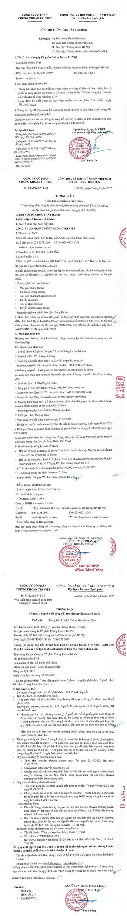 Tải bản đầy đủ tại đây. Tin liên quan Thông báo bán cổ phần của Công ty cổ phần thủy điện Sử Pán 2 do Tổng công ty Sông Đà – CTCP sở hữu 29/03/2022 07:00 Bổ sung giấy phép hoạt động của Ngân hàng thương mại TNHH một thành viên Dầu khí Toàn cầu 28/03/2022 11:53 CTCP Sản xuất kinh doanh dược và Trang thiết bị y tế Việt - Mỹ thông báo chào bán cổ phiếu ra công chúng 24/03/2022 14:28 Từ khóa Chứng khoán Trí Việt TVSC