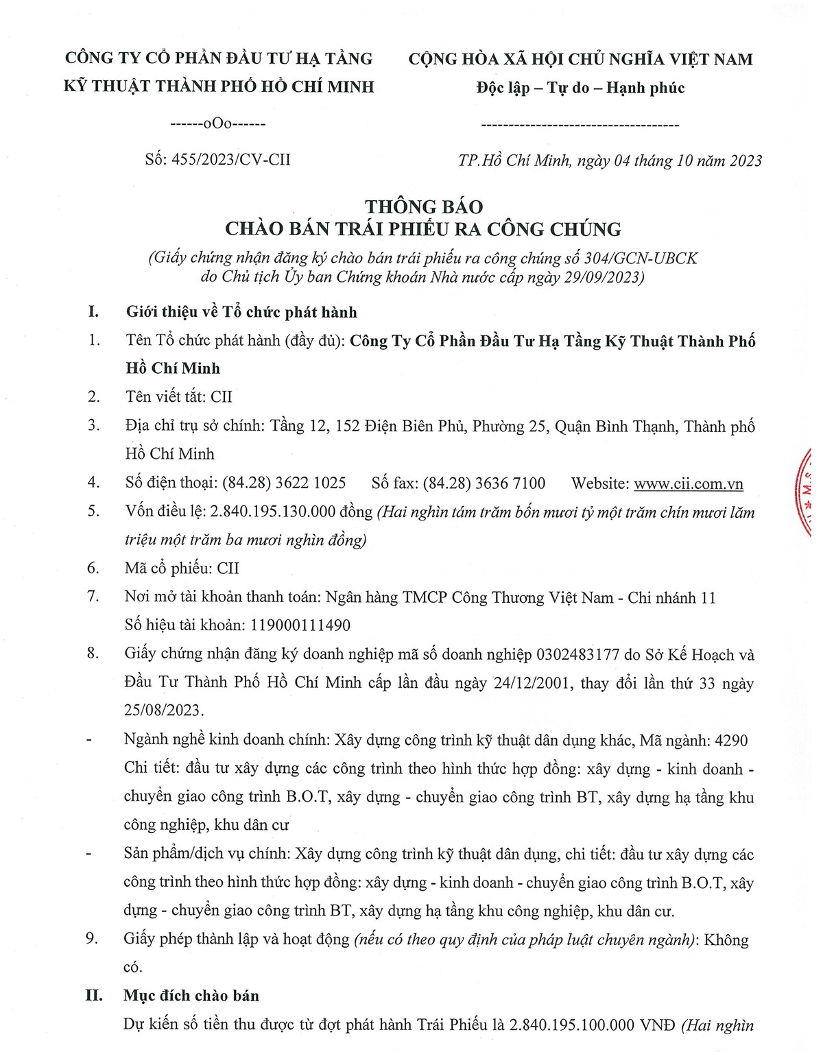 Đầu tư Hạ tầng Kỹ thuật TP. HCM (CII): Đang làm việc với tổ chức tài chính quốc tế để bảo lãnh phát hành gần 2.400 tỷ đồng trái phiếu 28/09/2023 14:10