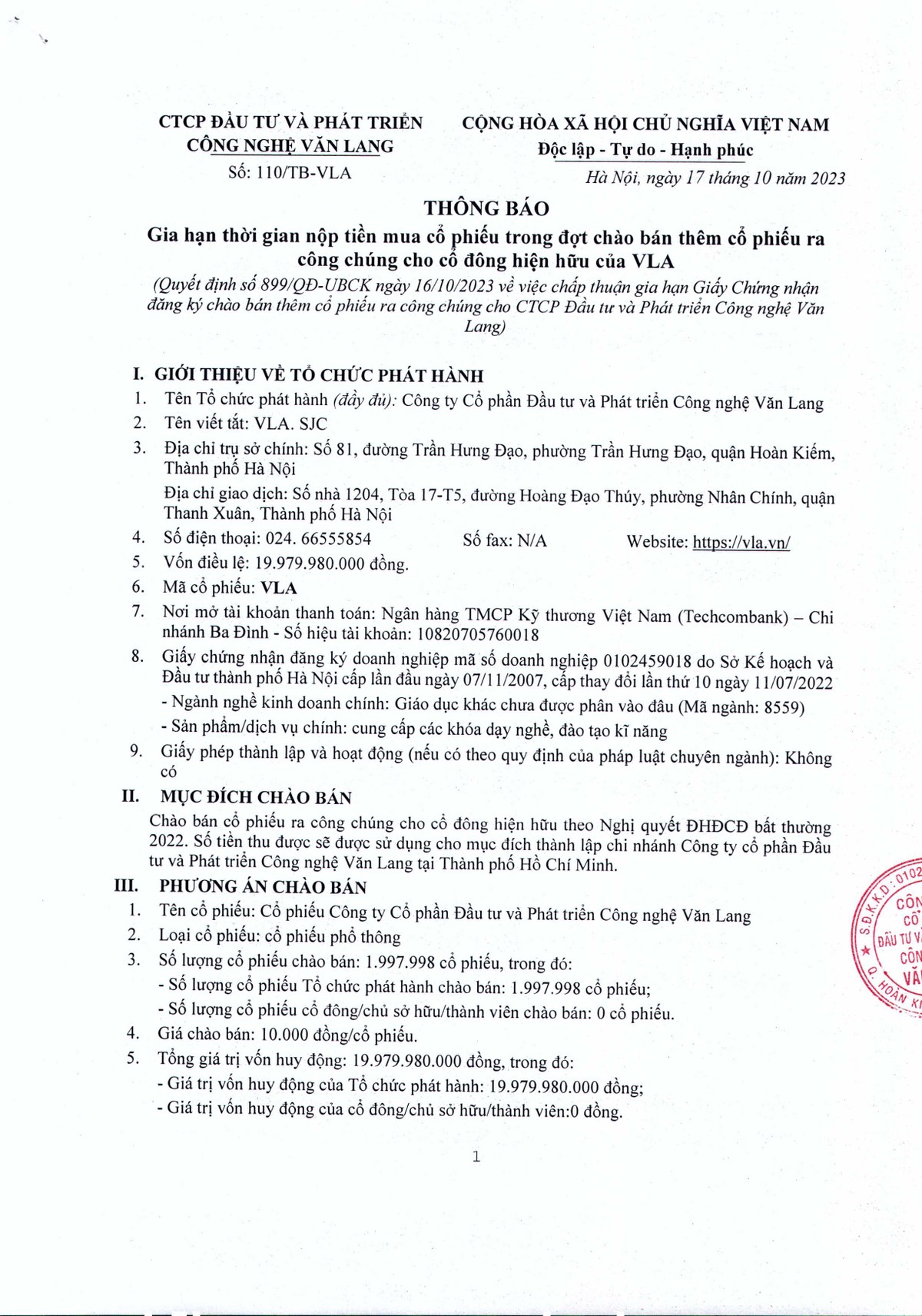 CTCP Đầu tư và Phát triển Công nghệ Văn Lang (VLA) thông báo chào bán cổ phiếu ra công chúng 18/08/2023 07:00
