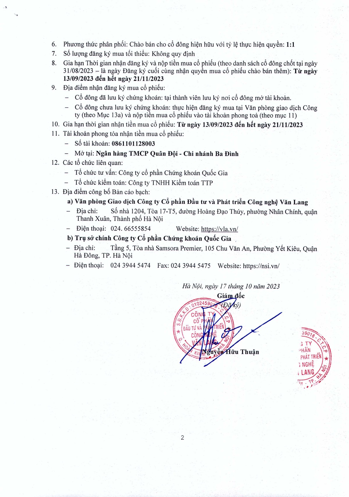 CTCP Đầu tư và Phát triển Công nghệ Văn Lang (VLA) thông báo gia hạn thời gian nộp tiền mua cổ phiếu trong đợt chào bán thêm cổ phiếu ra công chúng cho cổ đông hiện hữu 18/10/2023 07:00