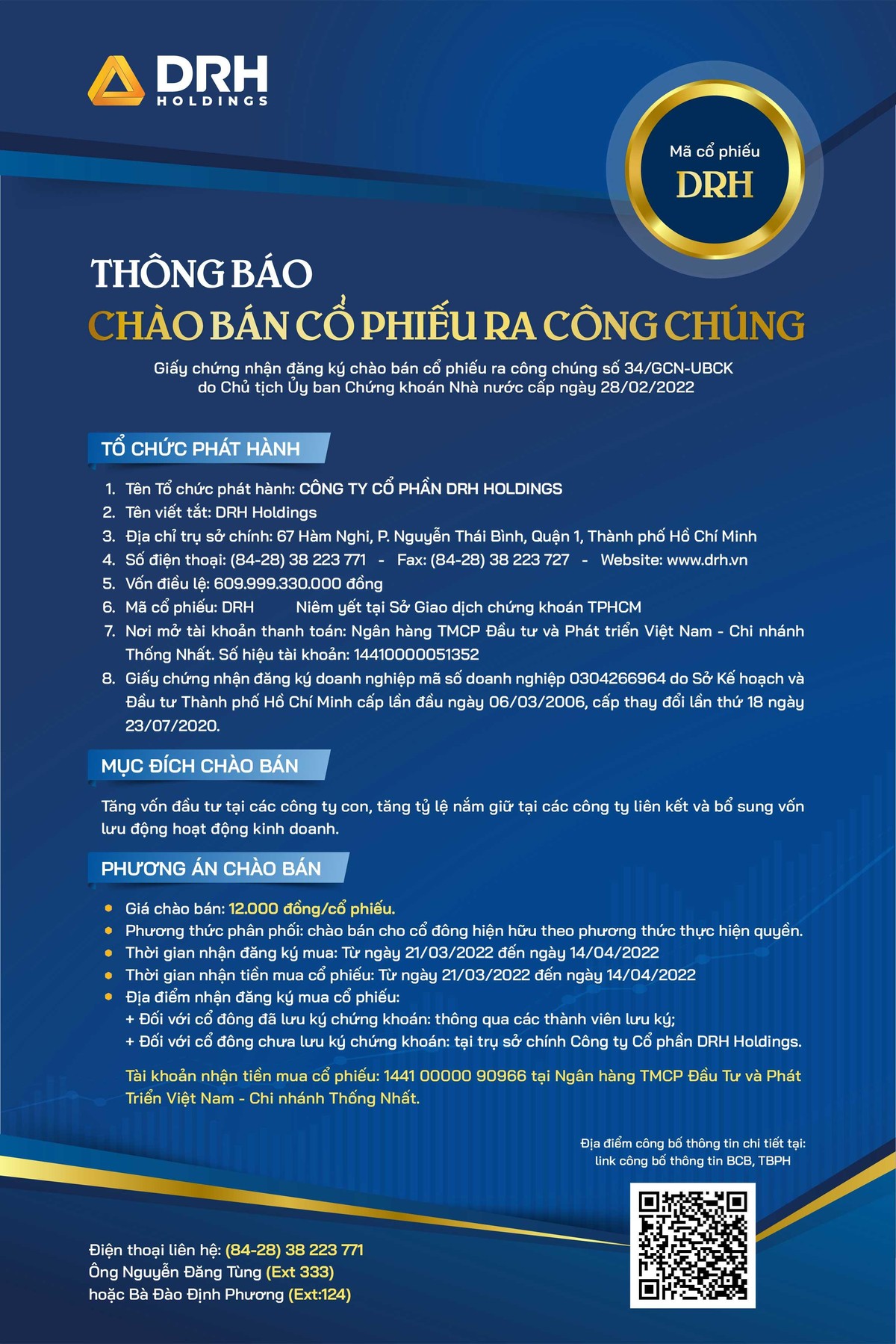 Tin liên quan CTCP Tập đoàn Bất động sản CRV thông báo chào bán cổ phiếu ra công chúng 01/03/2022 17:16 CTCP Chứng khoán VIX thông báo chào bán cổ phiếu ra công chúng 13/02/2022 01:00 CTCP Hãng Sơn Đông Á thông báo chào bán cổ phiếu ra công chúng 12/02/2022 07:00 Từ khóa CTCP DRH Holdings
