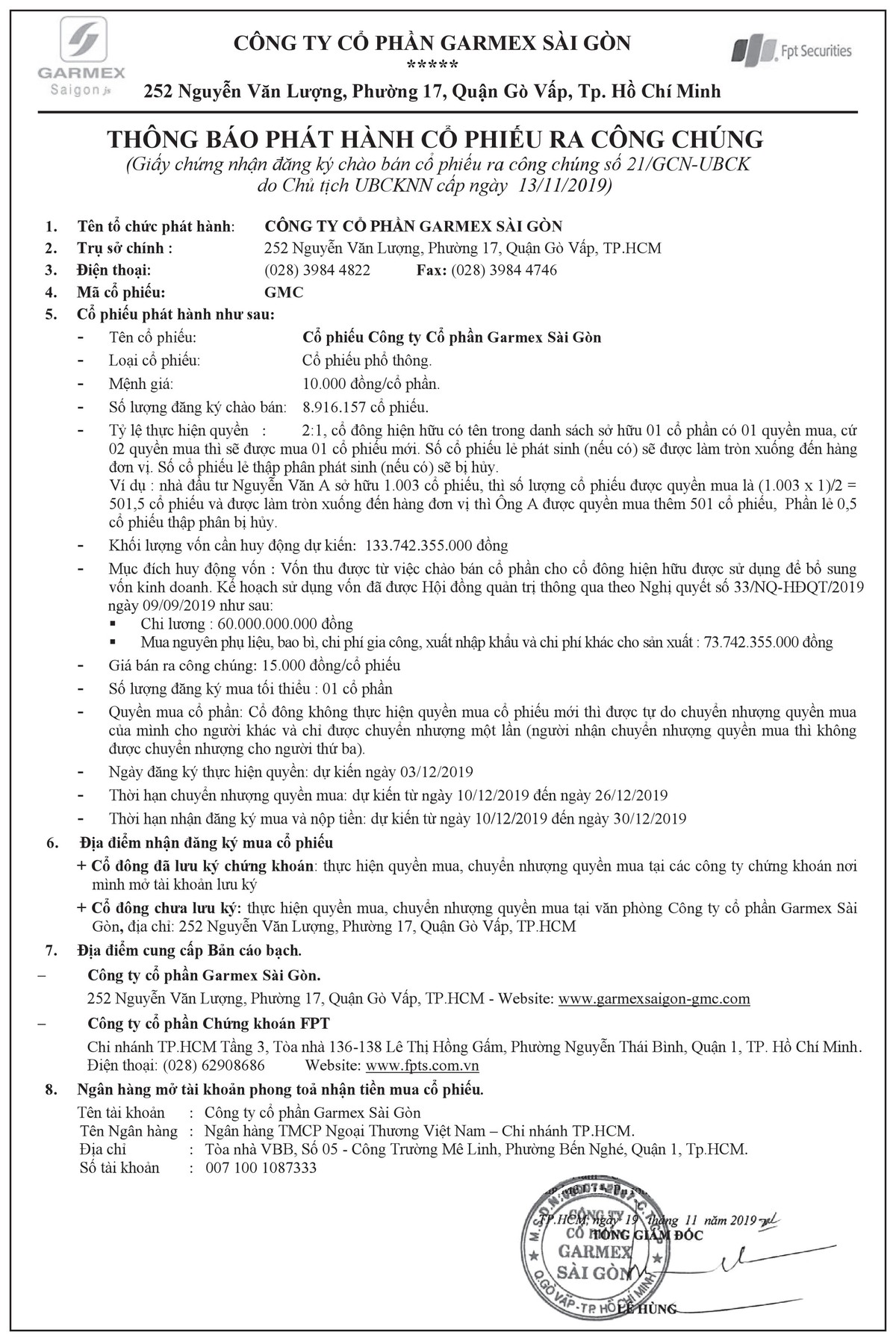 CTCP Garmex Sài Gòn thông báo phát hành cổ phiếu ra công chúng