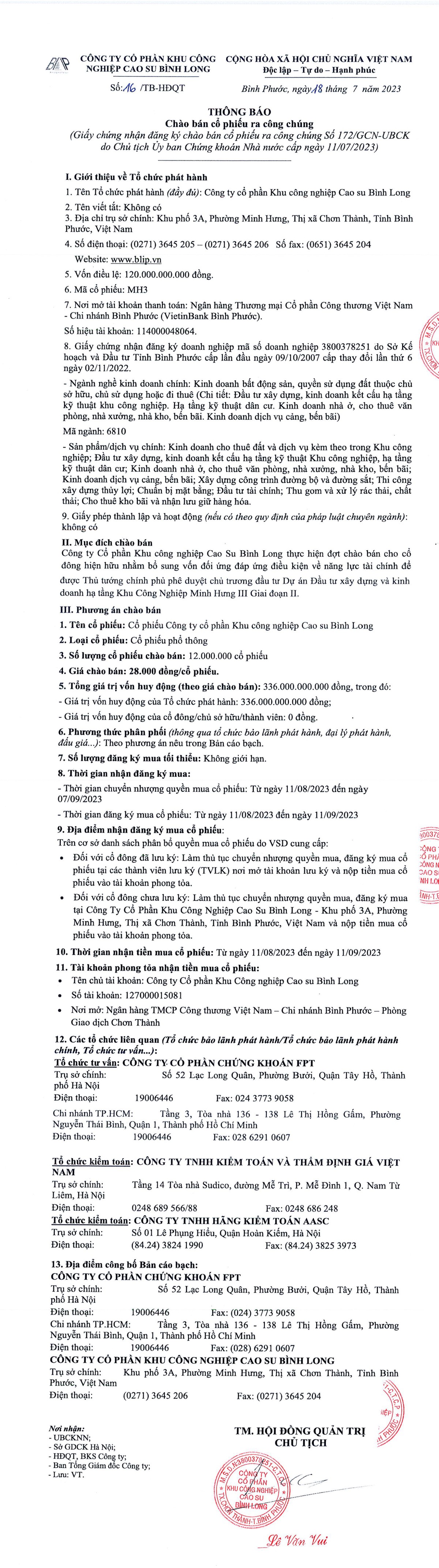 CTCP Khu công nghiệp Cao su Bình Long thông báo chào bán cổ phiếu ra công chúng
