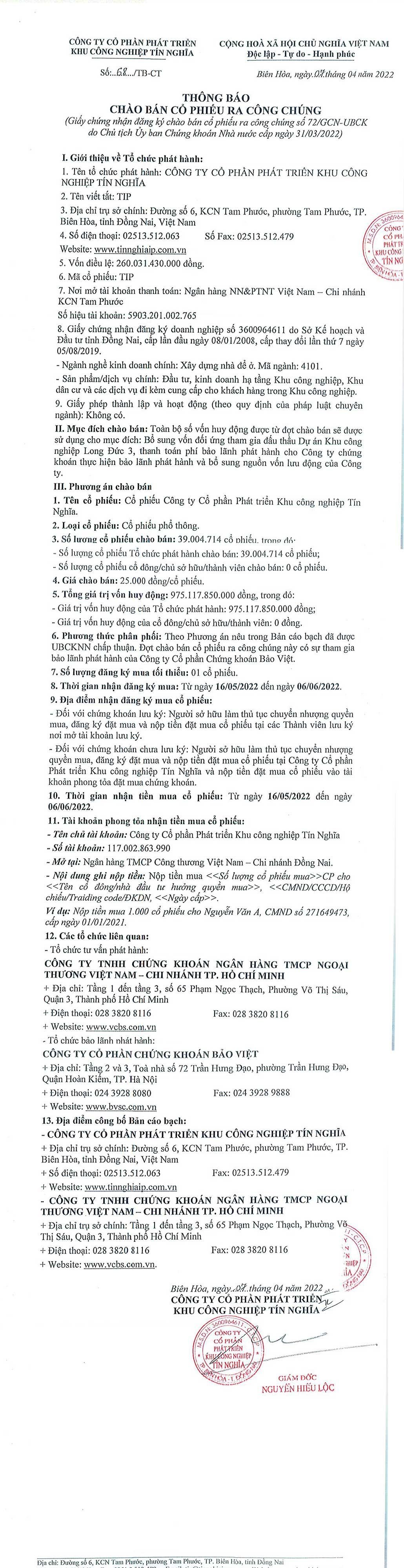 Tin liên quan CTCP Đầu tư và Thương mại TNG thông báo chào bán trái phiếu ra công chúng 06/04/2022 16:08 CTCP Dệt may Đầu tư Thương mại Thành Công (TCM) thông báo mời họp ĐHCĐ thường niên 2022 04/04/2022 08:00 CTCP Chứng khoán Trí Việt thông báo chào bán cổ phiếu ra công chúng 29/03/2022 15:30 Từ khóa CTCP Phát triển khu công nghiệp Tín Nghĩa