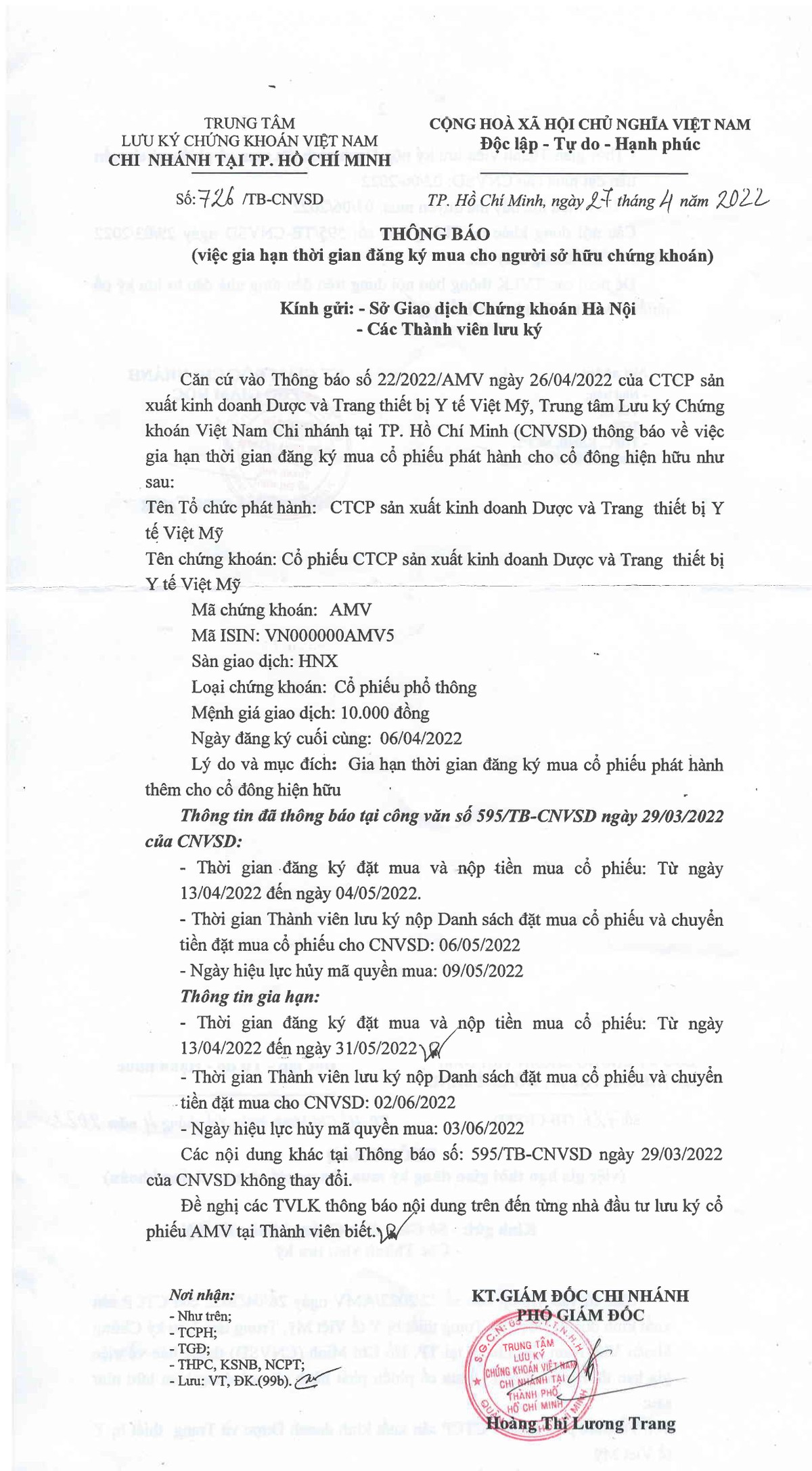 CTCP sản xuất kinh doanh Dược và Trang thiết bị Y tế Việt Mỹ thông báo về việc gia hạn thời gian đăng ký mua cổ phiếu phát hành cho cổ đông hiện hữu như sau: