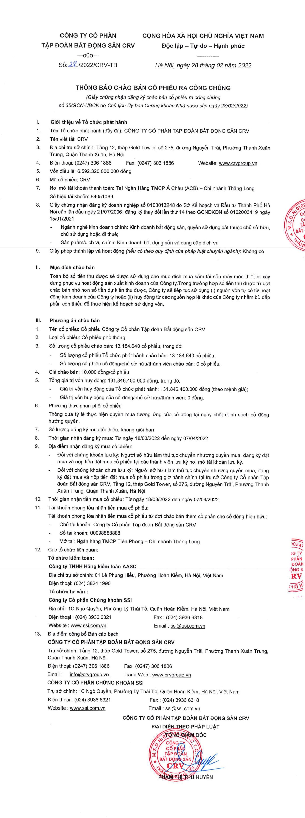 Tin liên quan CTCP Chứng khoán VIX thông báo chào bán cổ phiếu ra công chúng 13/02/2022 01:00 CTCP Hãng Sơn Đông Á thông báo chào bán cổ phiếu ra công chúng 12/02/2022 07:00 CTCP Tập đoàn Green+ thông báo chào bán cổ phiếu ra công chúng 25/01/2022 07:00 Từ khóa CRV CTCP Tập đoàn Bất động sản CRV