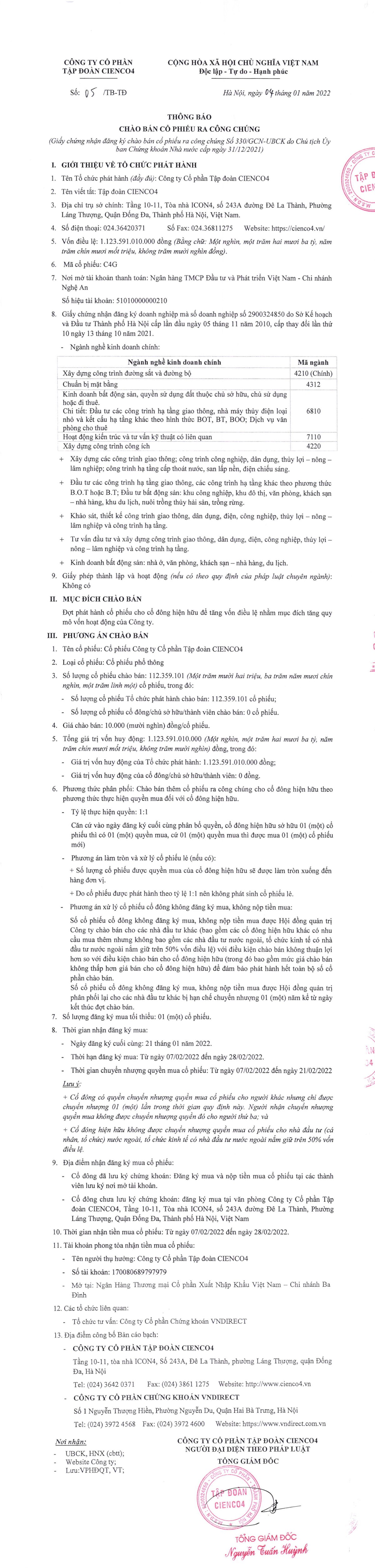 >> Chi tiết xem tại đây. Tin liên quan CTCP Dược Trung ương Mediplantex thông báo chào bán cổ phiếu ra công chúng 04/01/2022 11:09 CTCP Dược phẩm Agimexpharm (AGP) thông báo chào bán cổ phiếu ra công chúng 05/12/2021 07:00 Công ty cổ phần Đầu tư và Phát triển TDT thông báo chào bán cổ phiếu ra công chúng 05/11/2021 07:00 Từ khóa CIENCO4