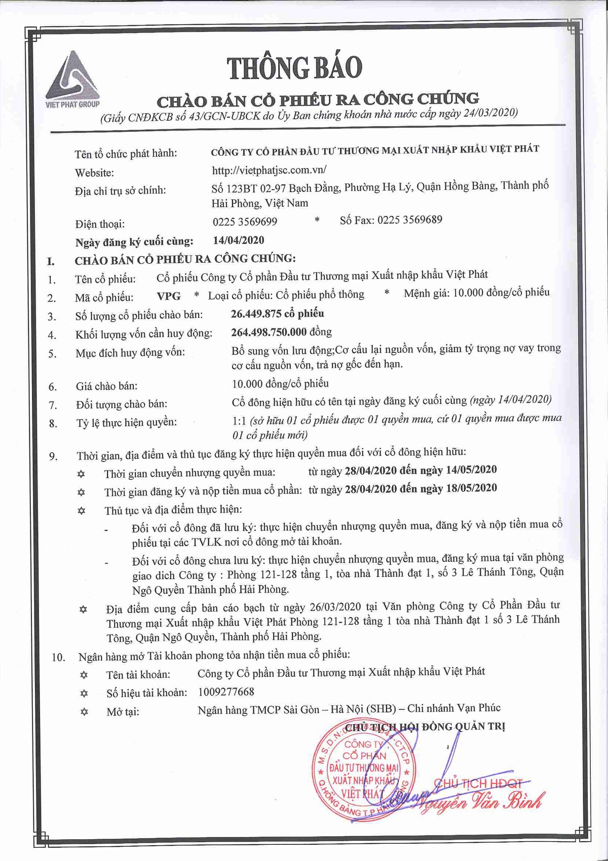 CTCP Thương mại xuất nhập khẩu Việt Phát thông báo chào bán cổ phiếu ra công chúng