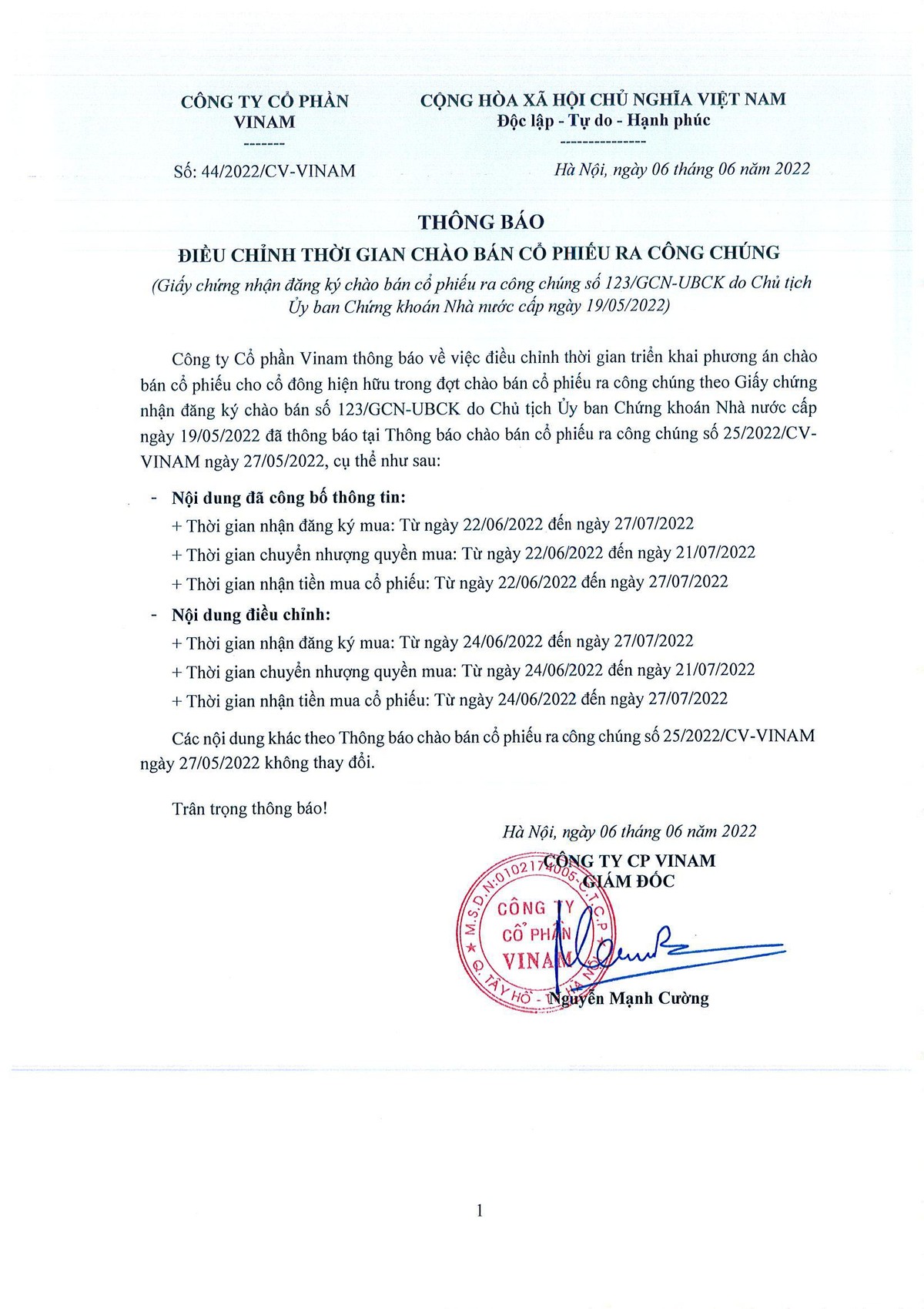 Tin liên quan CTCP Tập đoàn Nagakawa (NAG) thông báo chào bán cổ phiếu ra công chúng 06/06/2022 07:00 CTCP Vinam thông báo chào bán cổ phiếu ra công chúng 27/05/2022 17:04 CTCP Sản xuất Kinh doanh Dược và Trang thiết bị Y tế Việt Mỹ thông báo gia hạn đăng ký mua cho người sở hữu chứng khoán 04/05/2022 17:00 Từ khóa CTCP Vinam