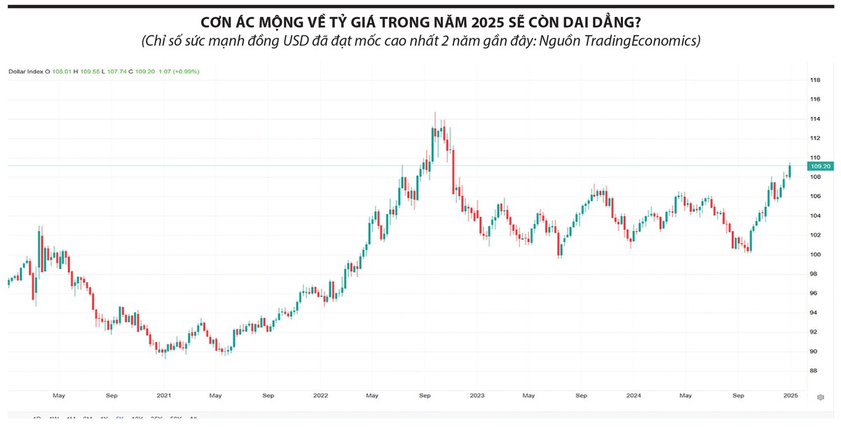 Năm 2025, tỷ giá USD/VND dự kiến tiếp tục đối mặt nhiều thách thức khi các chính sách thương mại của Tổng thống đắc cử Donald Trump được triển khai. Việc áp thuế 60% lên hàng hoá Trung Quốc và 20% với hàng nhập khẩu từ các quốc gia khác khiến đồng USD tăng giá, gây áp lực giảm giá lên VND. Thêm vào đó, dòng vốn đầu tư nước ngoài có nguy cơ dịch chuyển, ảnh hưởng tiêu cực đến xuất khẩu của Việt Nam. Dự báo, VND có thể mất giá từ 2,5-5% trong năm 2025, dù tình hình cung - cầu ngoại tệ trong nước vẫn ổn định.