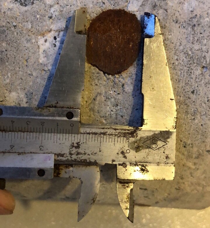 Các lõi bê tông được khoan cắt từ sàn lầu 2 ra có các đoạn sắt thép bị cắt rời ra theo các lõi bê tông, đường kính các đoạn sắt thép này đo được là 16 mm và 20 mm.