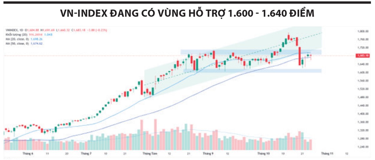 Tuần giao dịch mở đầu trong sắc đỏ khi VN-Index có lúc lao dốc gần 100 điểm - mức giảm mạnh nhất trong nhiều tháng - khiến tâm lý nhà đầu tư trở nên thận trọng. Các phiên sau đó chủ yếu diễn ra trong trạng thái giằng co quanh ngưỡng hỗ trợ 1.630 điểm, trước khi chỉ số hồi phục nhẹ và dao động giữa hai mốc kỹ thuật MA20 - MA50.
