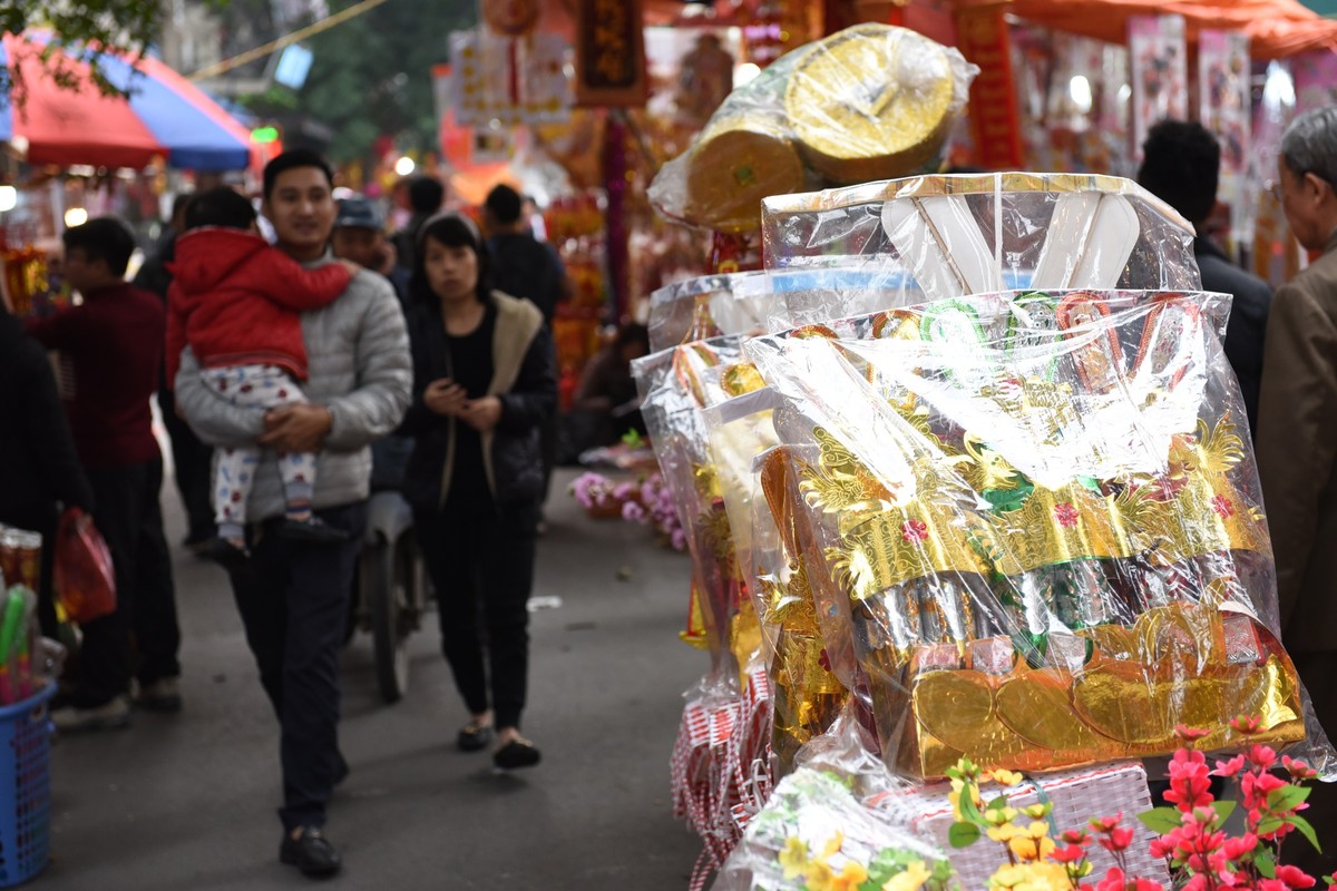 Những ngày nay, trên phố Hàng Mã không hiếm cảnh vàng mã được bày bán ngay trên lòng đường.