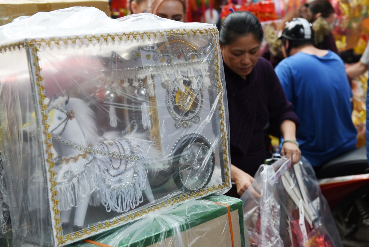 Không chỉ bán vàng mã thông thường, các cửa hàng còn bán các loại vàng mã đặc biệt. Trong ảnh là vàng mã cỗ xe ngựa trắng có giá 200.000 đồng.