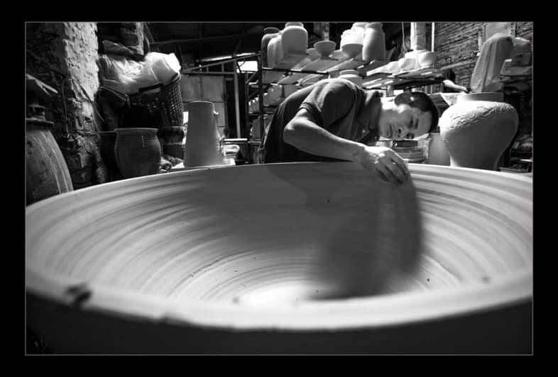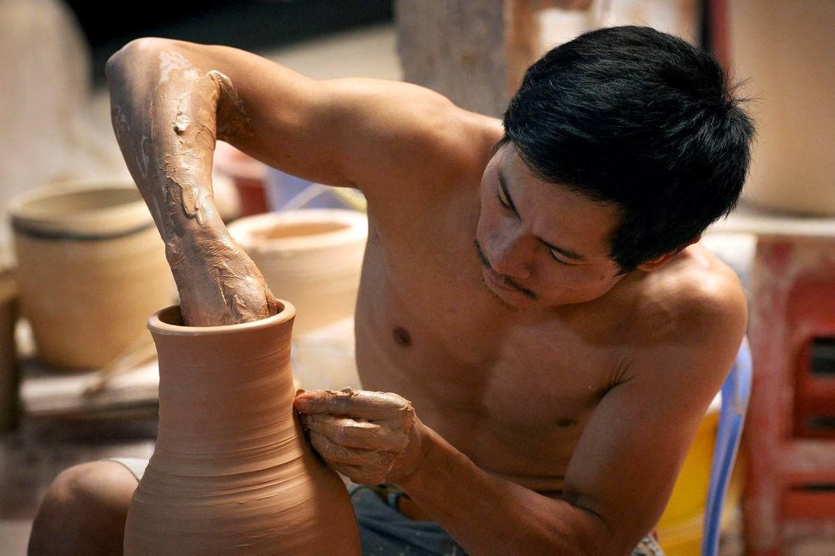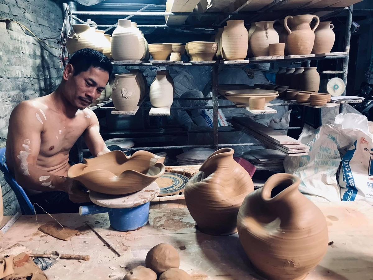 Mặc cho khách ngắm nghía, len lỏi khắp các ngõ ngách xưởng gốm, chạy đi chạy lại quanh mình để chụp ảnh, hỏi han, ghi hình, nghệ nhân Phạm Anh Đạo vẫn không một tích tắc ngừng tay. Anh miệt mài nặn, mải mê vê vuốt trên chiếc bàn xoay cũ kỹ mà do cơ chế thị trường đã chẳng người làng Bát Tràng nào còn làm như vậy.