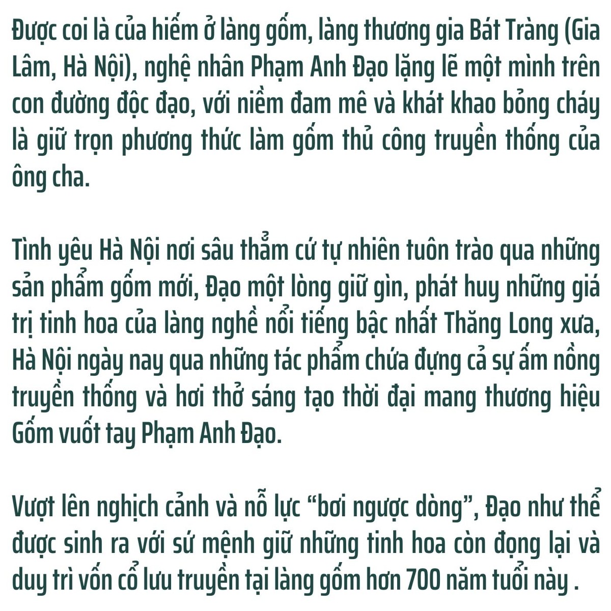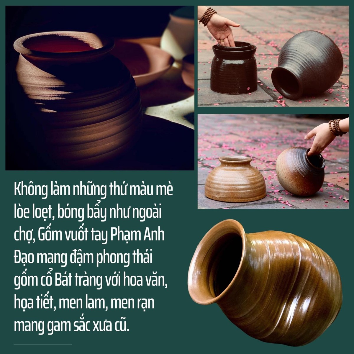 Tài hoa, tình yêu đất, khao khát và nỗ lực nâng tầm giá trị cổ truyền của Phạm Anh Đạo suốt hơn 20 năm qua đã giúp anh tìm được tiếng giao hòa của những người yêu gốm. Anh chẳng những trở thành ông chủ của một thương hiệu gốm được nhiều khách hàng ưa thích, mà còn đánh thức một số hộ sản xuất gốm quay lại với cách làm gốm vuốt tay truyền thống.