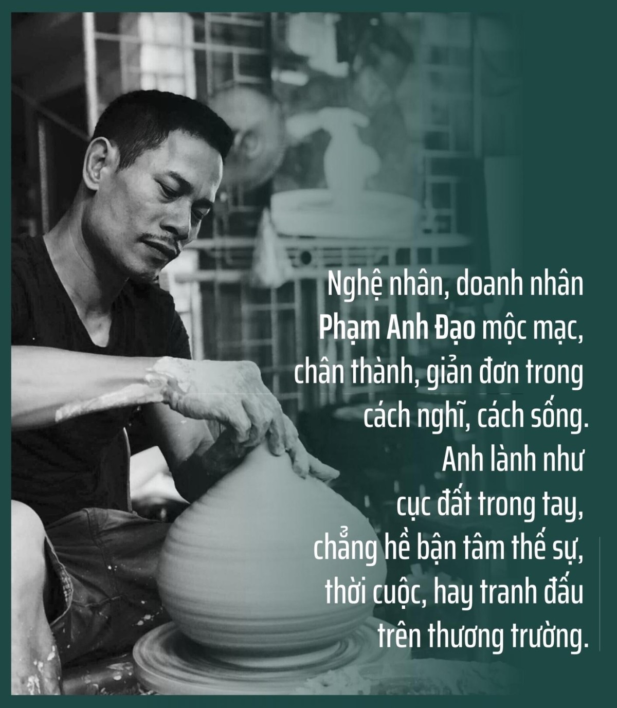 Nghệ nhân, doanh nhân Phạm Anh Đạo mộc mạc, chân thành, giản đơn trong cách nghĩ, cách sống. Anh lành như cục đất trong tay, chẳng hề bận tâm thế sự, thời cuộc, hay tranh đấu trên thương trường.